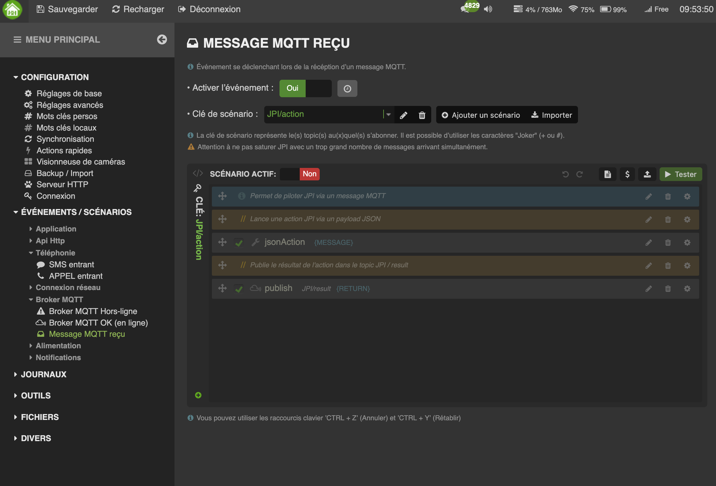 Nous allons dans Évènements / Scénarios > Broker MQTT > Message MQTT reçu.