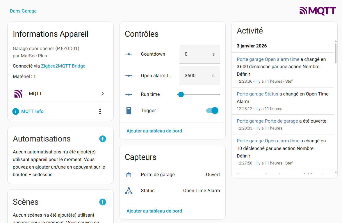 J’ai voulu utiliser Matterbridge Home Assistant Add-on pour pouvoir utiliser un module me permettant d’ouvrir ma porte de garage via Alexa. Ce module est compatible Zigbee Tuya, mais je n’ai qu’une Green, et il faudrait si j’ai bien compris, une box compatible Tuya. Celui-ci est bien reconnu par Zibgee2MQTT et MatterBridge mais n’est pas visible par Alexa (contrairement aux autres objets Zigbee que j’ai chez moi).
