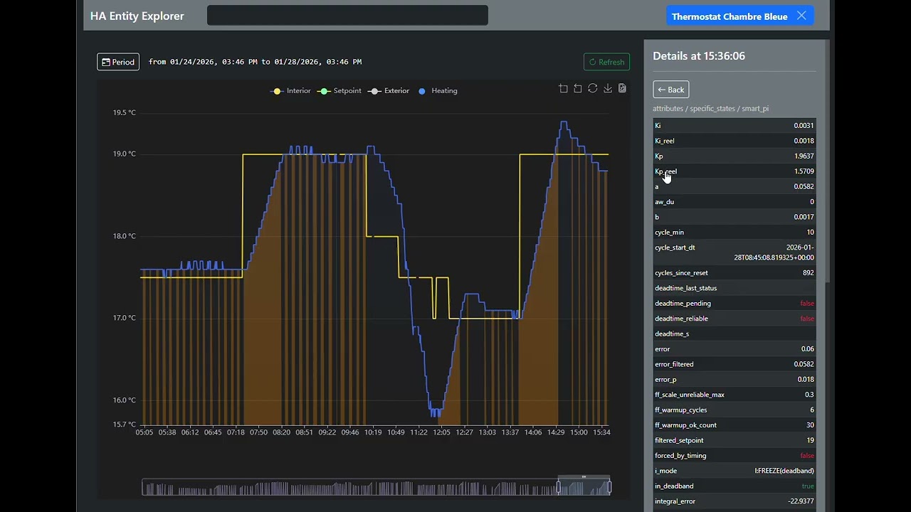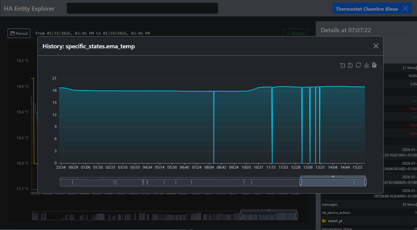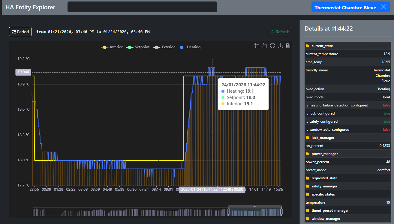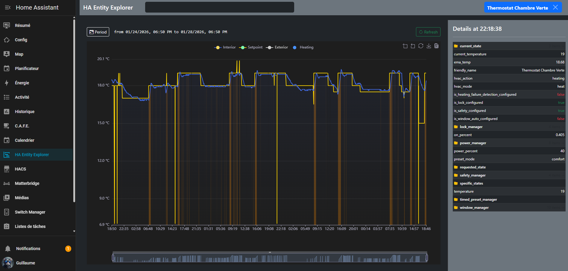 HA Entity Explorer est une appli python qui récupère les données necessaires d’une entité auprès de l’API HA, et va afficher le graphique de l’entité pour la période selectionnée.