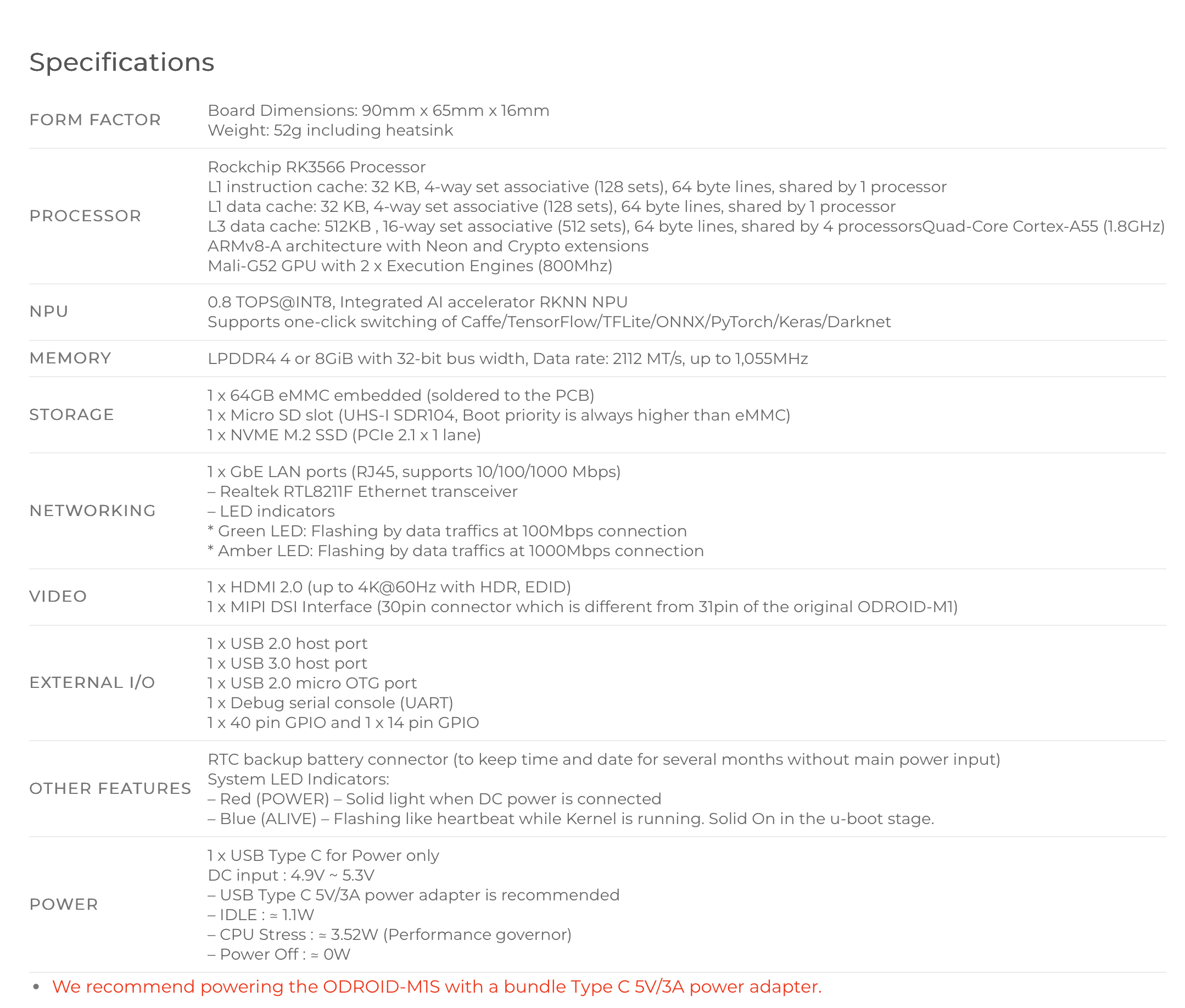 Très intéressant, c’est la plateforme parfaite pour faire tourner Home Assistant, zigbee2mqtt et mqtt et quelques environnements Docker. On a l’équivalent d’une Raspberry Pi 5CM. En outre je signale que l’Odroid M1S est doté d’un NPU pour l’IA et l’analyse d’images. Voici un copie des specs récupérée sur la page du produit : [odroid-specs]