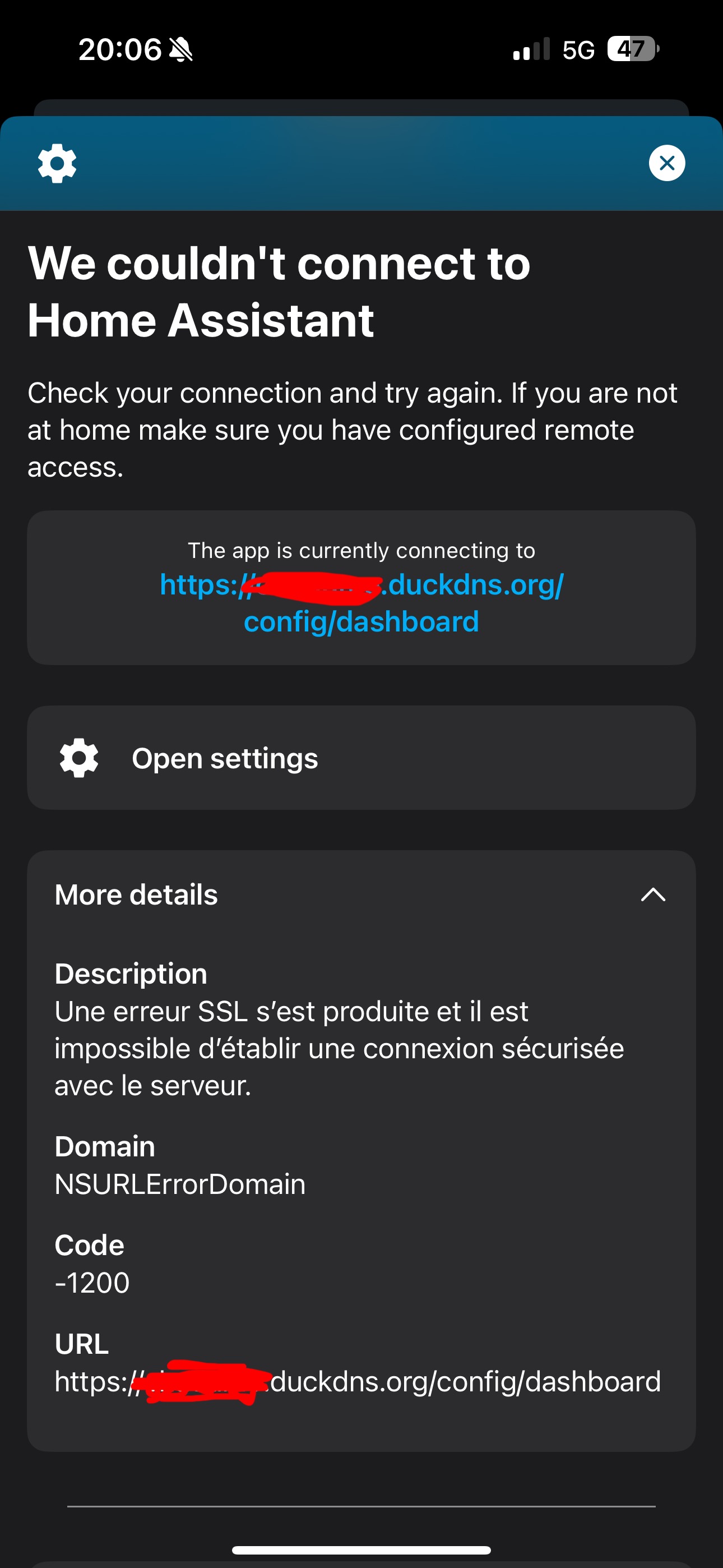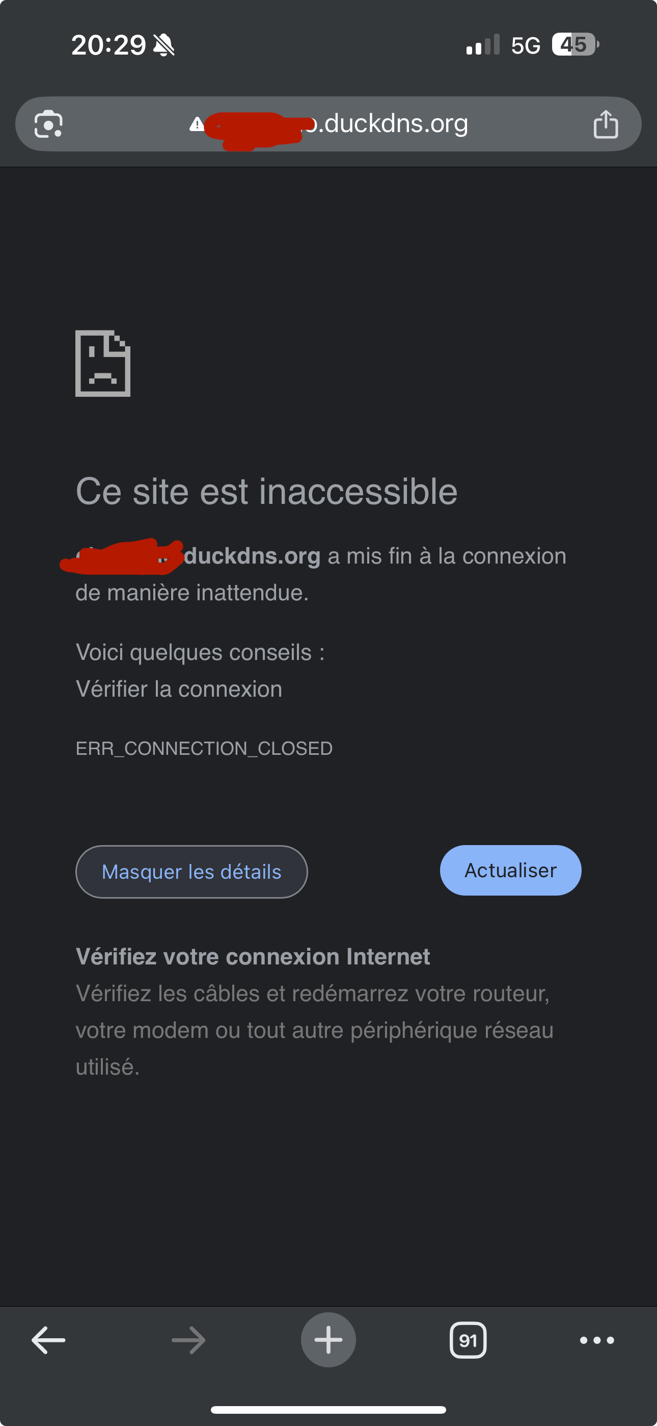 J’accède parfaitement en https via l’URL Duckdns publique lorsque je passe en Wifi depuis chez moi. Par contre (y compris depuis chez moi), si je coupe le Wifi de mon tél, la connexion 4G/5G de mon tél ne me permets pas d’accéder à HA.