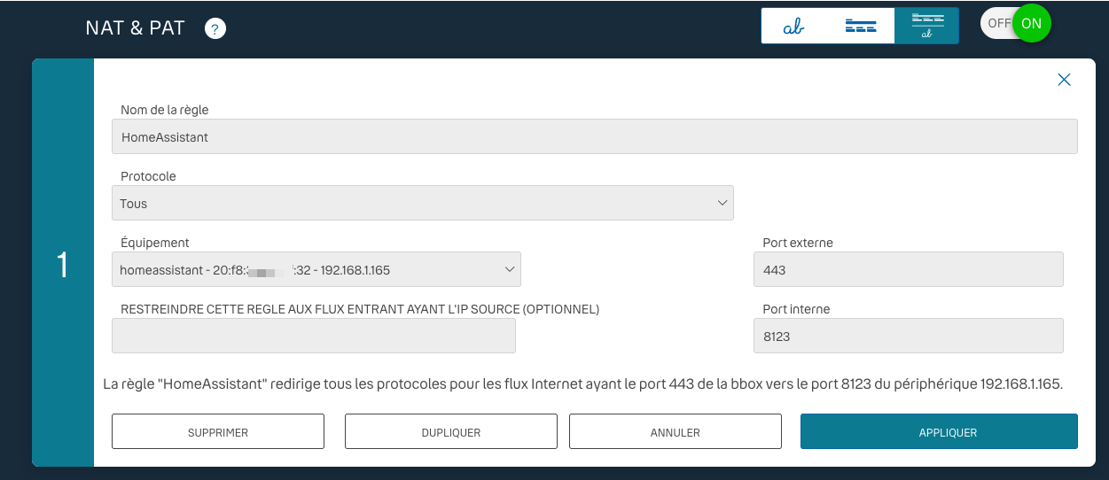 J’ai fait la redirection de port sur le NAT pour que le https renvoi du port 443 externe au 8123 interne.