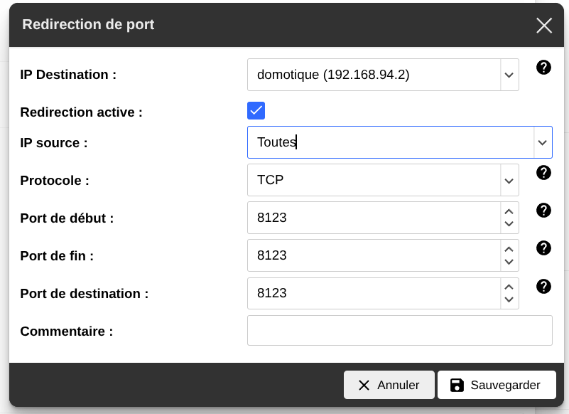 Le tuto il t’a fait forwarder le port 8123 vers le 8123 ?