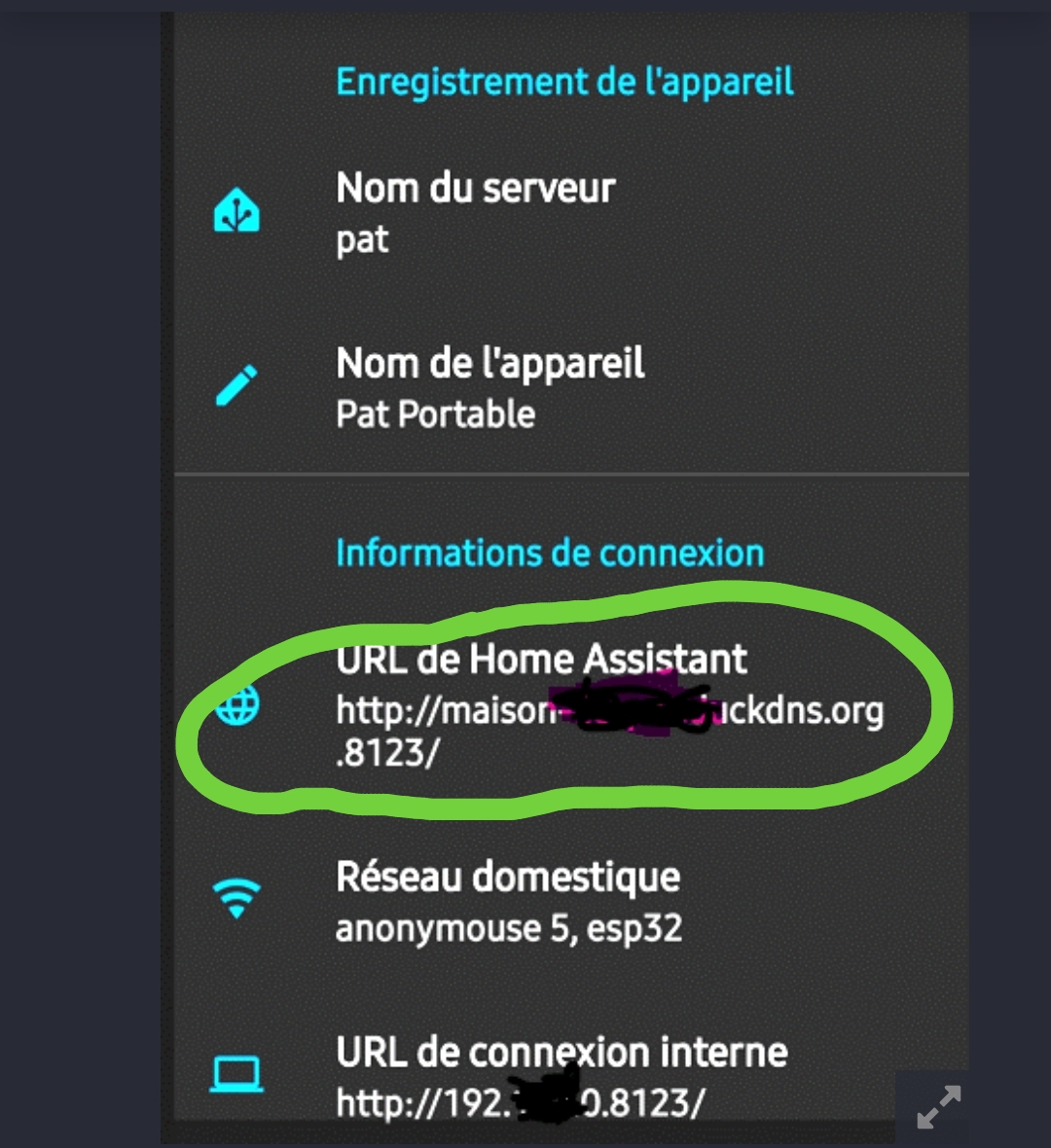Si j’en crois ta capture d’écran, avant le port 8123, c’est deux point ( : ) qu’il faut et non pas un point (.), au delà du fait que la 1ere adresse devrait être en https