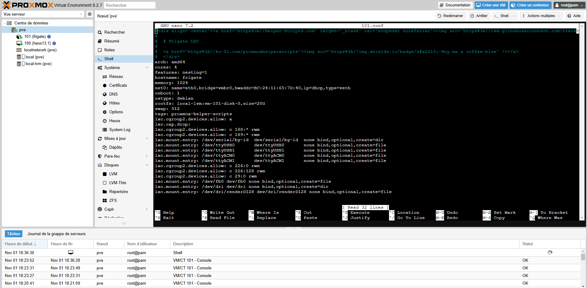 Dans la console proxmox, on va aller modifier le fichier de configuration du LXC directement. Celui-ci est dans */etc/pve/lxc* où se trouve chaque lxc avec un nom en xxx.conf (xxx est l'identifiant de votre lxc).