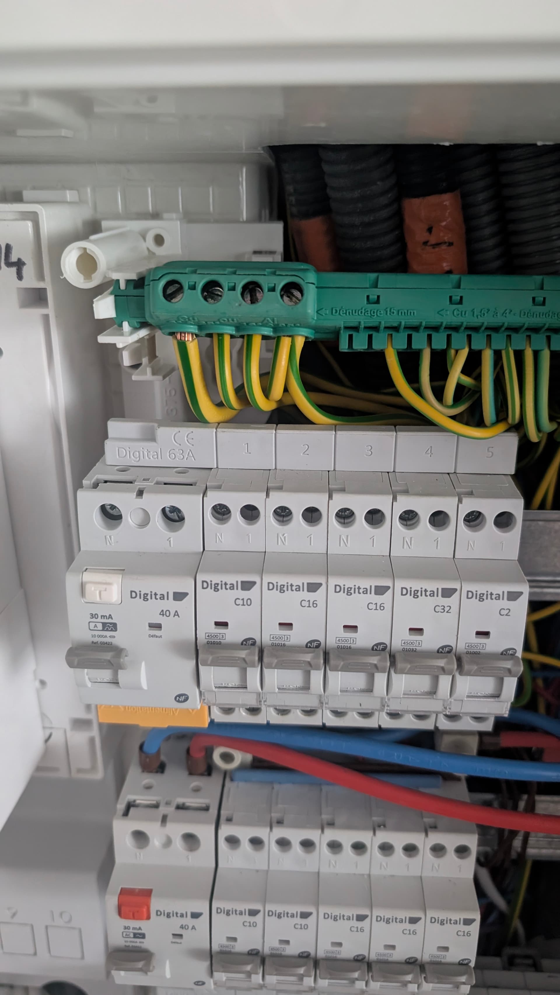 La répartition sur les disjoncteurs se fait par le haut avec des peignes intégralement protégé sauf sur la rangée 2 avec des peignes basiques et de 2 gros câbles.