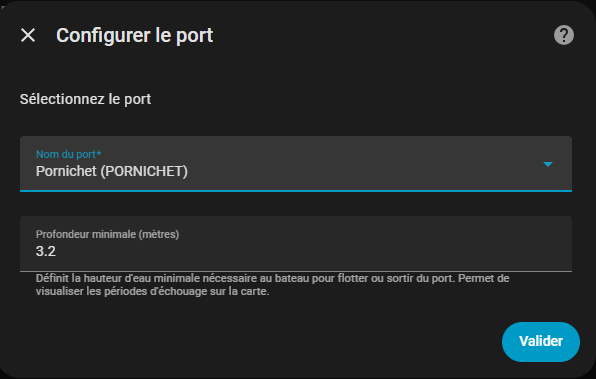 - (Optionnel) Définir la profondeur minimale nécessaire pour naviguer — cette valeur sera utilisée pour adapter l’affichage des graphiques afin de rendre plus lisible les périodes où la naviguation sera possible. Laissez à 0 si non nécessaire.