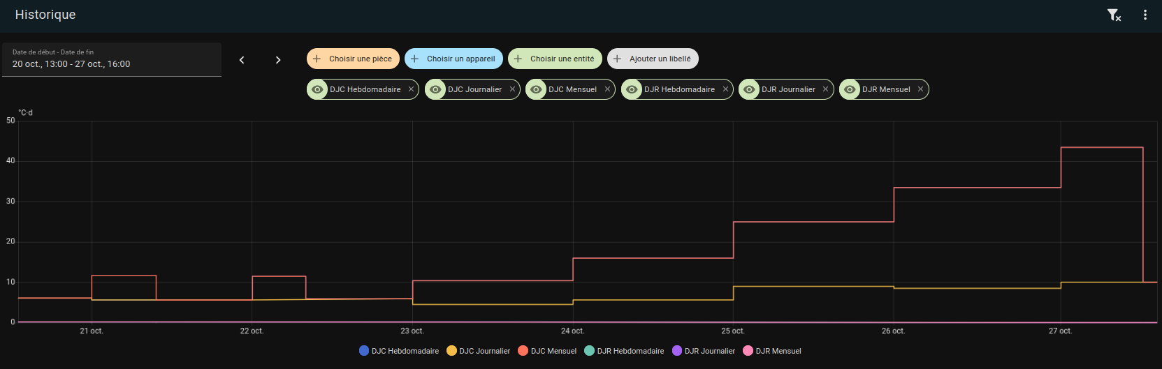 Cette intégration calcule les degrés-jours de chauffage (DJC/HDD) et les degrés-jours de refroidissement (DJR/CDD) à partir des mesures de température extérieure de votre installation (si vous n’avez pas de mesure de la température extérieur, vous pouvez également utiliser un service météo qui vous fourni la température extérieur en °C ou °F). Les degrés-jours sont des indicateurs qui permettent de quantifier les besoins énergétiques de votre domicile.