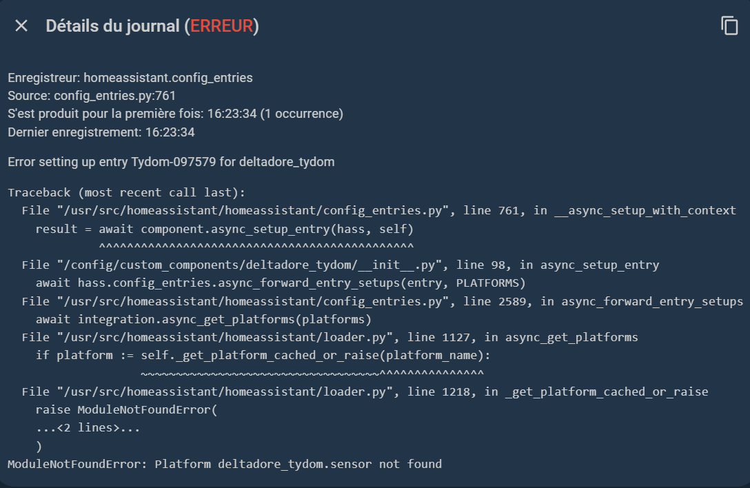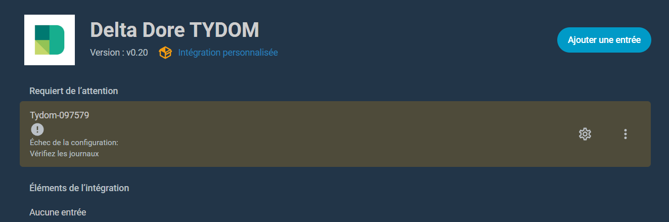 Concernant la méthode manuelle, rien ne remonte, j’ai suivis la méthode pas à pas après la création du répertoire et la copie du dossier indiqué et après un redémarrage, je vais dans paramètre, appareil et service, intégrations, ajouter une intégration ; Delta Dore Tydom = rien!