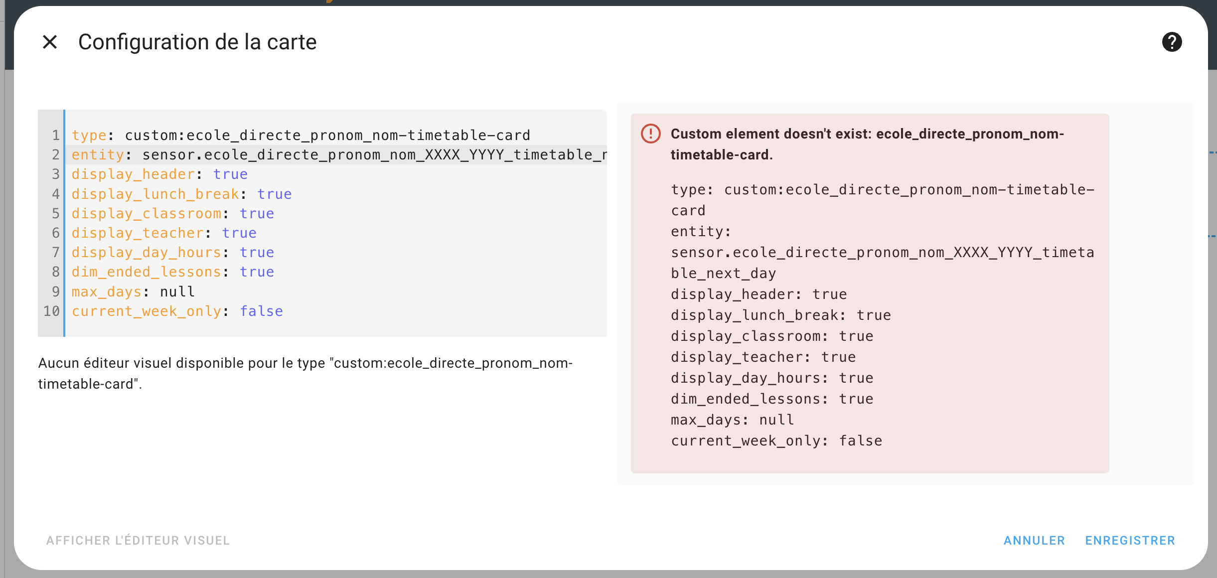 Dans entity tu dois mettre sensor.ecole_directe_prenomdetonenfant_nomdetonenfant_grades (tu as le nom exact du sensor sous « outils de développement » - « Etats »)