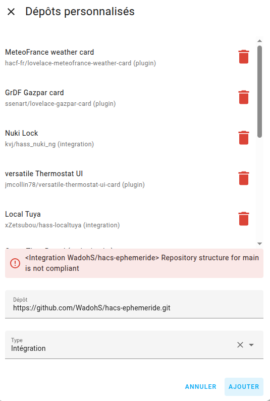 apres soit avoir ajouter le repo, ou copier les fichiers dans votre custom, redemarrer HA.