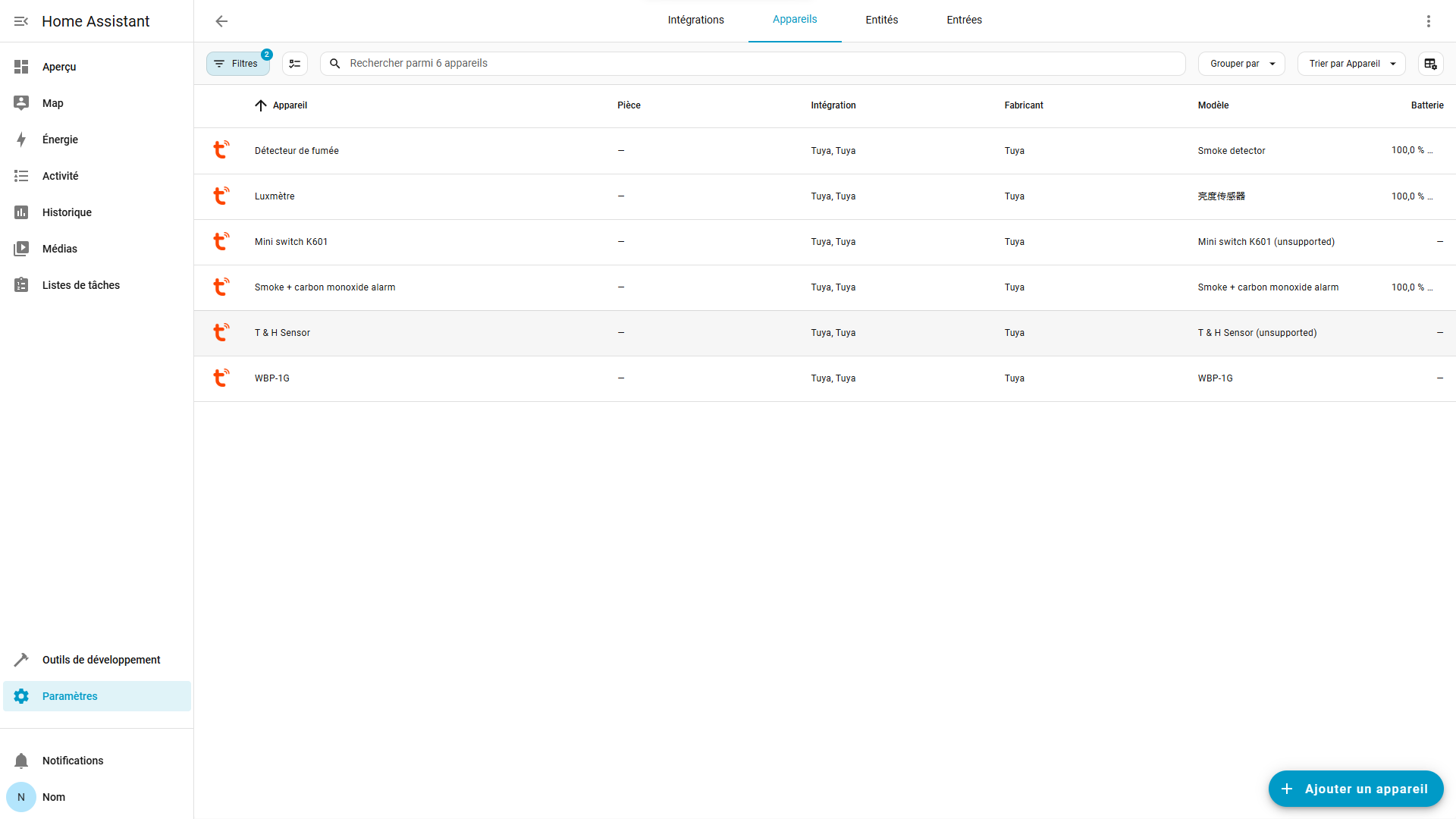 NB : Le mot “unsupported” ne semble pas fiable, car pour mon “Mini-switch K601”, qui est un relais wifi, ça marche bien avec HA : je peux allumer et éteindre ce relais avec HA (et avec SmartLife), et pourtant dans HA il y a aussi écrit “unsupported”, comme pour mon capteur de Température & Hygrométrie (“T & H sensor”).
