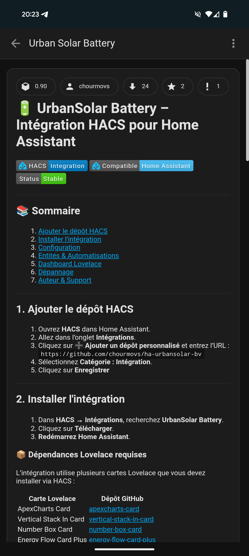Votre intégration me paraît tout indiqué mais je n’arrive malheureusement pas à l’installer, la partie HACS fonctionne bien mais une fois dans la