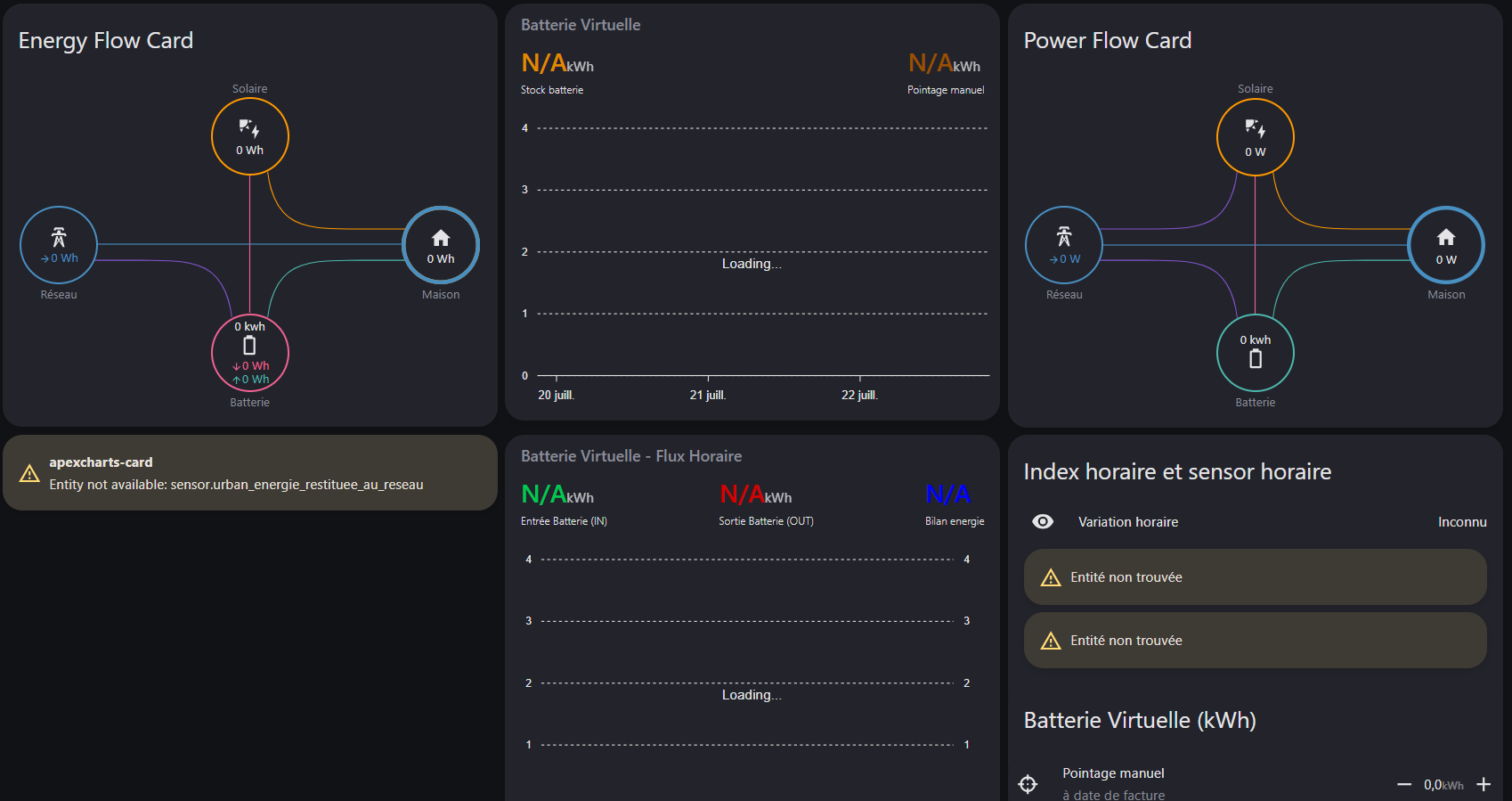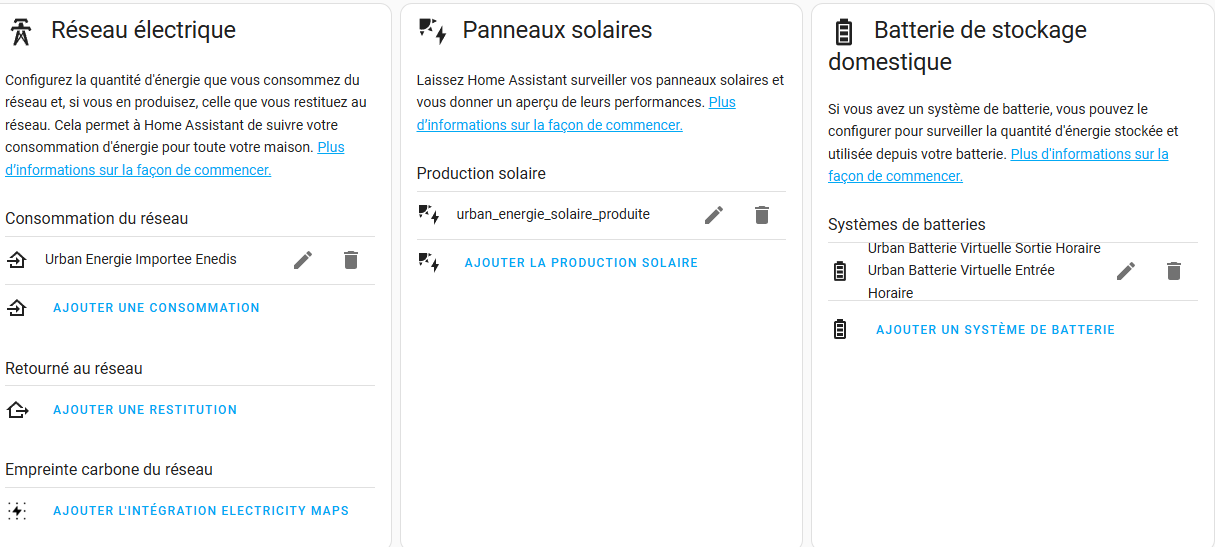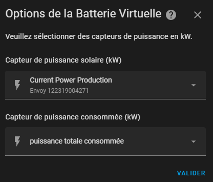Cette intégration permet de suivre précisément l’état de stock de votre batterie virtuelle (en kWh), en vous appuyant sur deux entités puissances :