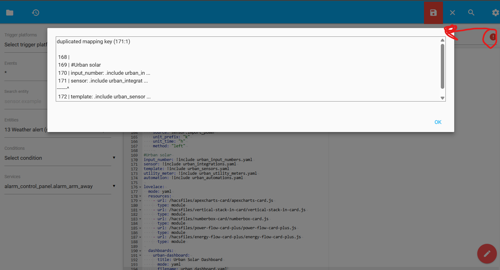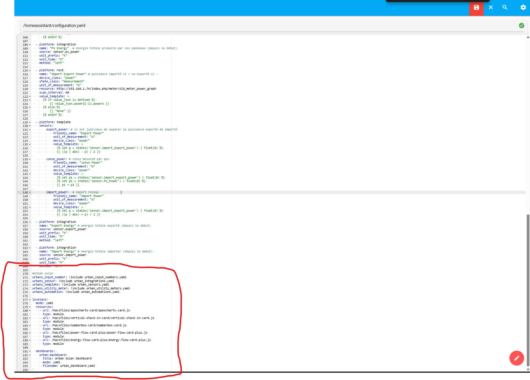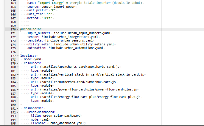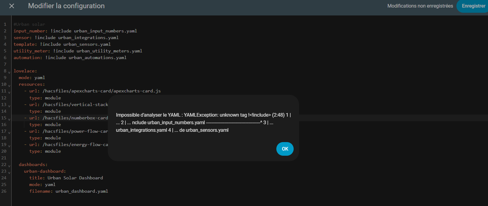 Pour le dashboard, je copie le code dans un dashboard que je crée moi, je ne passe pas par le config.yaml . Il faut bien vérifier que vous n’avez pas deja ces variables là déclarée ailleurs dans le yaml pour autre chose, sinon il faut changer le nom, comme le automation urban dans mon exemple