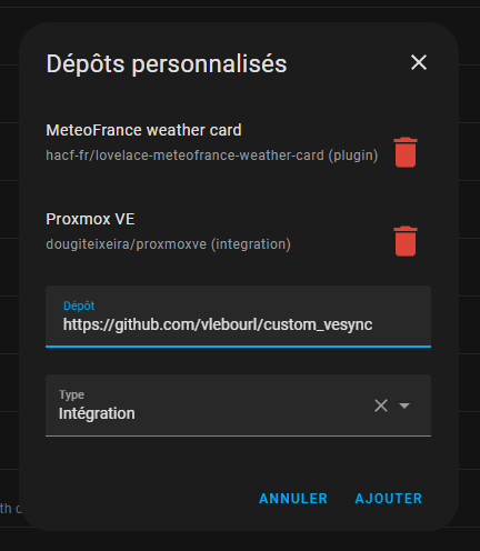 Je suis donc tombé sur un sujet sur la commu HA ils parlent d’ajouter un repo personnalisé via HACS (chose que j’ai déjà faite pour d’autres intégrations)