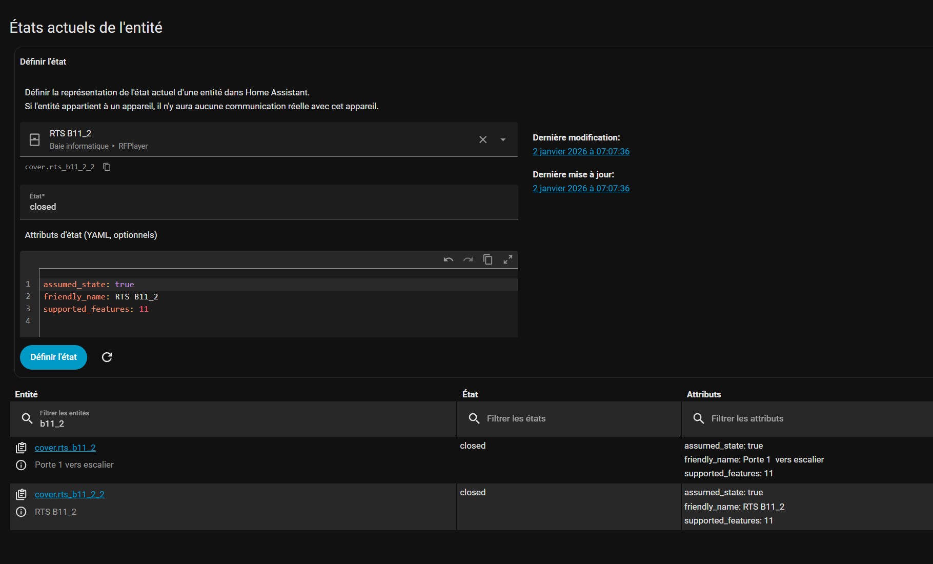 alors c’est une automatisation qui fonctionnait l’hiver dernier ( je l’avais désactiver et là je veux la remettre en route mais la commande du volet ne s’exécute plus ) avec la télécommande rts cela fonctionne !