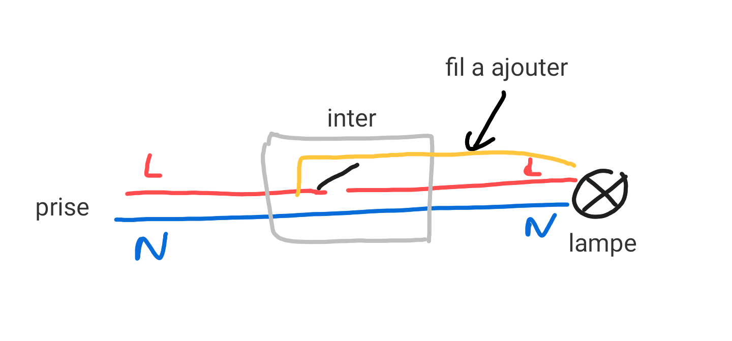 Je regarderai ça demain ou semaine prochaine. C’est un inter qui se démonte car c’est moi qui l’ai installé. Le fil est un fil avec enveloppe fil torsadé " à l’ancienne" ça se debine assez facilement ( c’est pour ça que j’ai mis des petites gaines thermo). Donc peut être que je pourrai essayer de passer un fil sur la longueur entre la lampe et l’inter ( environ 10 cm).