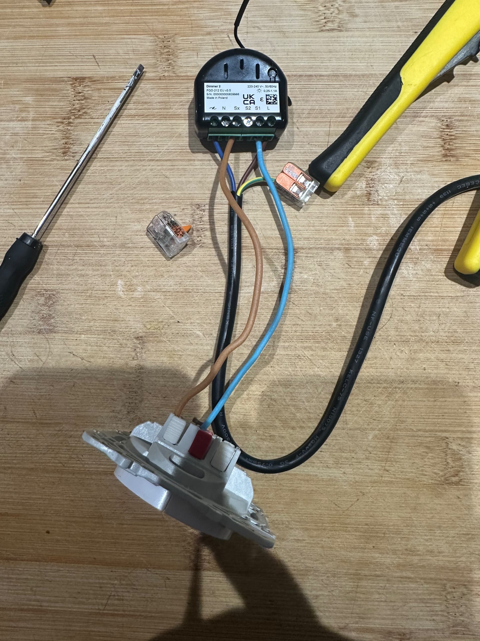 Et bien malgré le binding identique à celui testé avec succès sur mon dimmer2 du salon (avec charge), aucun mouvement d’interrupteur ne commande ma led. J’ai respecté le montage suivant, pour info l’alimentation est sur prise le temps des tests.