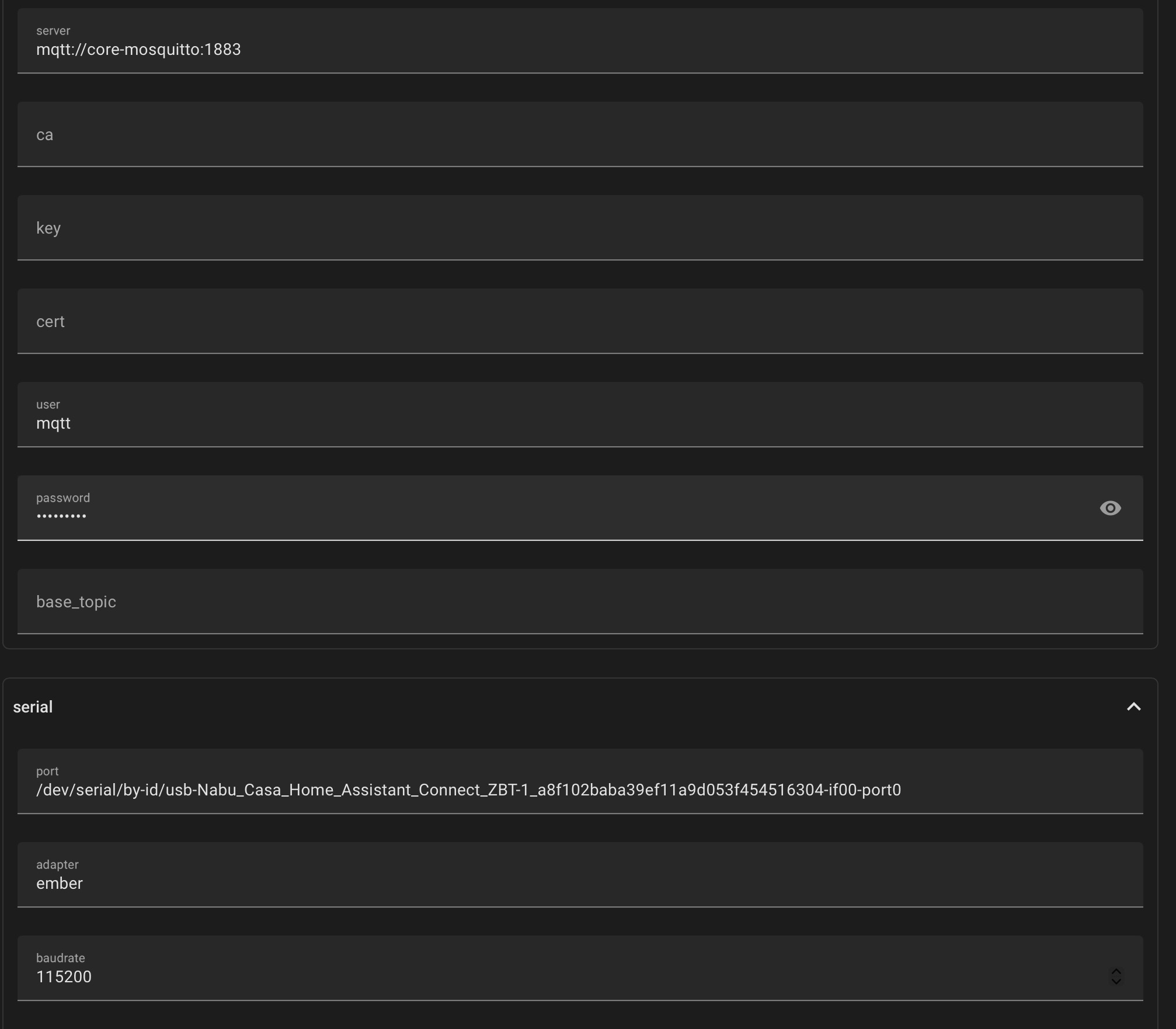 [22:01:31] INFO: Preparing to start... [22:01:31] INFO: Socat not enabled [22:01:32] INFO: Starting Zigbee2MQTT... Starting Zigbee2MQTT without watchdog. [2026-01-25 22:01:33] info: z2m: Logging to console, file (filename: log.log) [2026-01-25 22:01:33] info: z2m: Starting Zigbee2MQTT version 2.7.2 (commit #unknown) [2026-01-25 22:01:33] info: z2m: Starting zigbee-herdsman (8.0.1) [2026-01-25 22:01:33] info: zh:ember: Using default stack config. [2026-01-25 22:01:33] info: zh:ember: ======== Ember Adapter Starting ======== [2026-01-25 22:01:33] info: zh:ember:ezsp: ======== EZSP starting ======== [2026-01-25 22:01:33] info: zh:ember:uart:ash: ======== ASH Adapter reset ======== [2026-01-25 22:01:33] info: zh:ember:uart:ash: RTS/CTS config is off, enabling software flow control. [2026-01-25 22:01:33] info: zh:ember:uart:ash: Serial port opened [2026-01-25 22:01:33] info: zh:ember:uart:ash: ======== ASH starting ======== [2026-01-25 22:01:38] info: zh:ember:uart:ash: ======== ASH Adapter reset ======== [2026-01-25 22:01:38] info: zh:ember:uart:ash: ======== ASH starting ======== [2026-01-25 22:01:43] info: zh:ember:uart:ash: ======== ASH Adapter reset ======== [2026-01-25 22:01:43] info: zh:ember:uart:ash: ======== ASH starting ======== [2026-01-25 22:01:48] info: zh:ember:uart:ash: ======== ASH Adapter reset ======== [2026-01-25 22:01:48] info: zh:ember:uart:ash: ======== ASH starting ======== [2026-01-25 22:01:53] info: zh:ember:uart:ash: ======== ASH Adapter reset ======== [2026-01-25 22:01:53] info: zh:ember:uart:ash: ======== ASH starting ======== [2026-01-25 22:01:58] error: z2m: Error while starting zigbee-herdsman [2026-01-25 22:01:58] error: z2m: Failed to start zigbee-herdsman [2026-01-25 22:01:58] error: z2m: Check for possible solutions [2026-01-25 22:01:58] error: z2m: Exiting... [2026-01-25 22:01:58] error: z2m: Error: Failed to start EZSP layer with status=HOST_FATAL_ERROR. at EmberAdapter.initEzsp (/app/node_modules/.pnpm/zigbee-herdsman@8.0.1/node_modules/zigbee-herdsman/src/adapter/ember/adapter/emberAdapter.ts:666:19) at EmberAdapter.start (/app/node_modules/.pnpm/zigbee-herdsman@8.0.1/node_modules/zigbee-herdsman/src/adapter/ember/adapter/emberAdapter.ts:1538:24) at Controller.start (/app/node_modules/.pnpm/zigbee-herdsman@8.0.1/node_modules/zigbee-herdsman/src/controller/controller.ts:143:29) at Zigbee.start (/app/lib/zigbee.ts:70:27) at Controller.start (/app/lib/controller.ts:101:13) at start (/app/index.js:149:5)