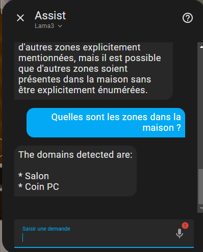 Sur le principe, cela fonctionne, l’assistant comprend et répond, mais il ne connaît que quelques éléments de mon infrastructure, par exemple les zones Salon et Coin PC, alors que j’ai une dizaines de zones définies. Idem pour les sensors, il n’en connaît qu’une poignée sur les centaines qui existent.