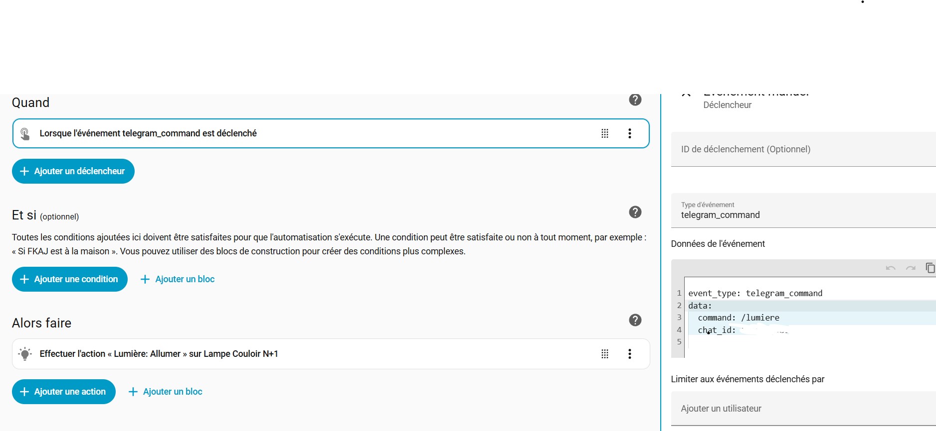 J’essaie de créer une automatisation qui me permette d’activer ou désactiver le mode absence en envoyant un message via Telegram. J’ai déjà créé une automatisation “mode absent” qui déclenche l’activation de la caméra, la détection des portes, etc (Test manuel OK). Et aussi j’ai bien créé un bot Telegram et je reçois les notifications correctement (par exemple lorsqu’on sonne à la porte). Je voudrais maintenant pouvoir envoyer un message à mon bot pour activer ou désactiver le mode absence. J’ai tout essayé, j’ai regardé partout, mais je suis un peu perdu et je n’y arrive pas depuis l’interface d’automatisations :