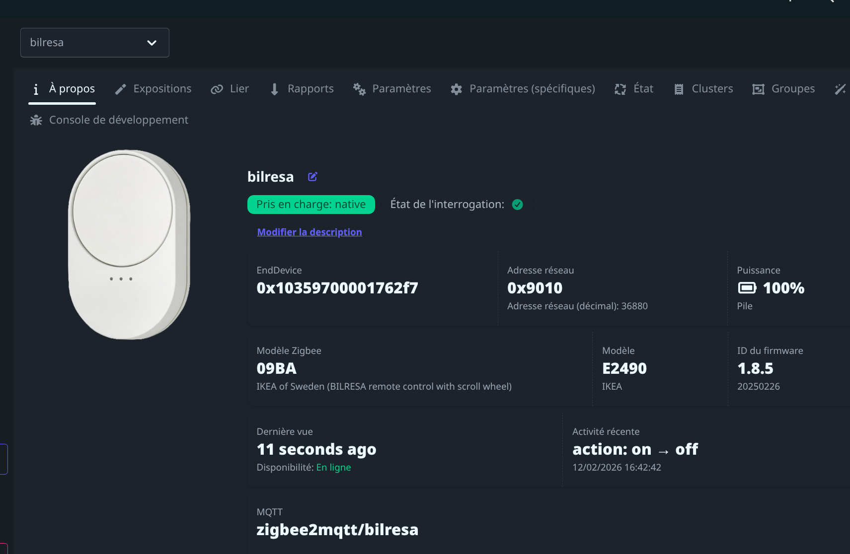 bon c’est mitigé surtout que d’après la fiche de Z2M elle se mets en veille et il faut la reveiller lrs d’un premier appui lorsque c’est le cas