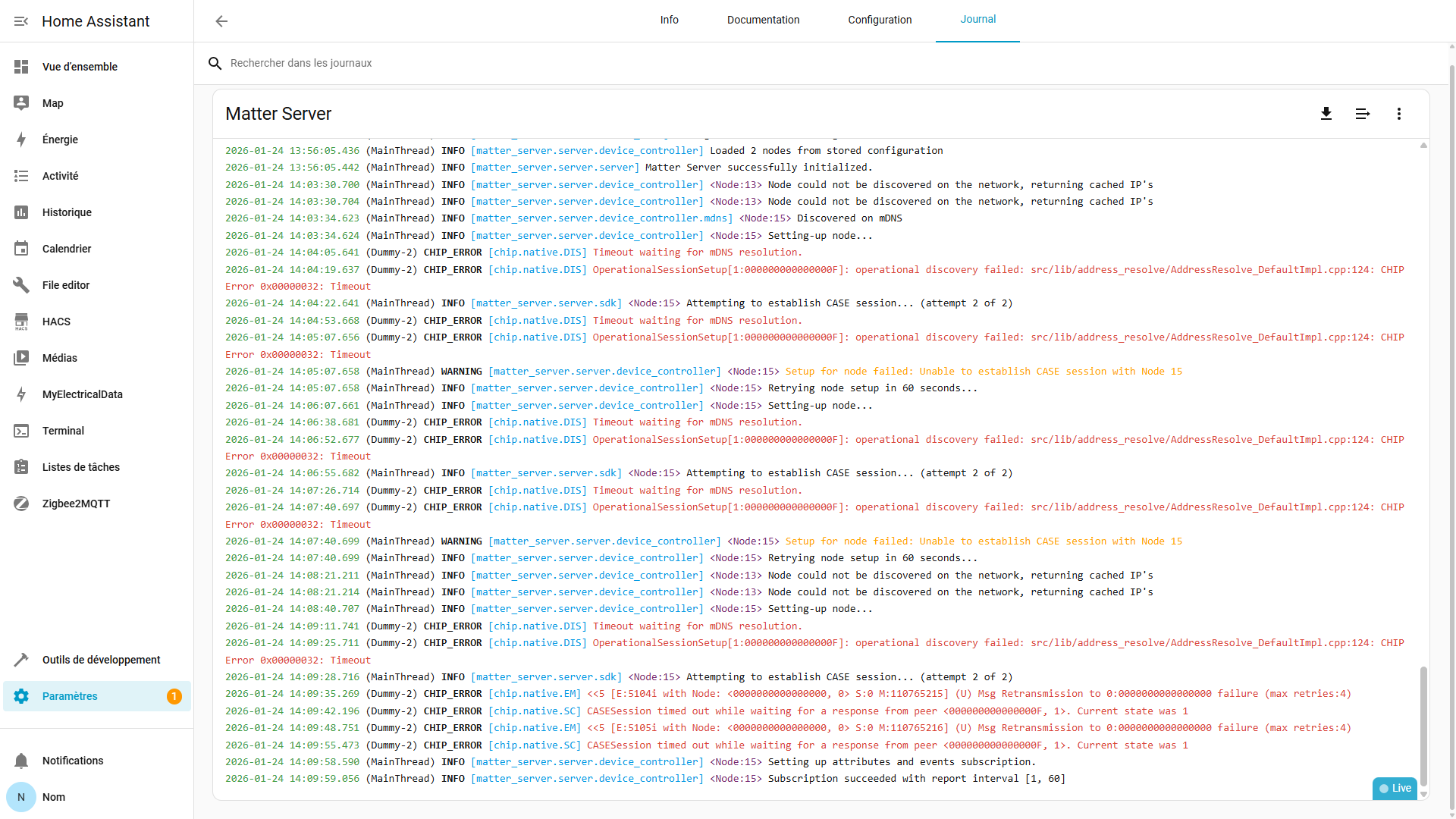 Bon finalement pendant que je tapais ce post un de mes 2 appareils Matter est redevenu disponible (mais pas l’autre), mais on dirait dans le log Matter que ça a été laborieux :
