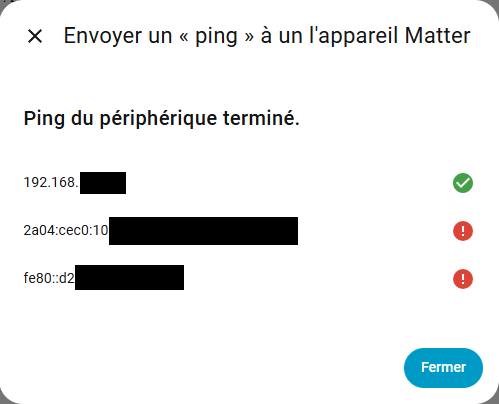 En tout cas, mes appareils Matter over wifi fonctionnent quand même parfois, alors que je n’ai rien changé dans la config de mon routeur (notamment ils ont toujours ces adresse IP V4 que je leur ai fixées), mais au cours de ces premières semaines d’usage je constate qu’ils sont instables = régulièrement indisponibles dans HA(OS)…