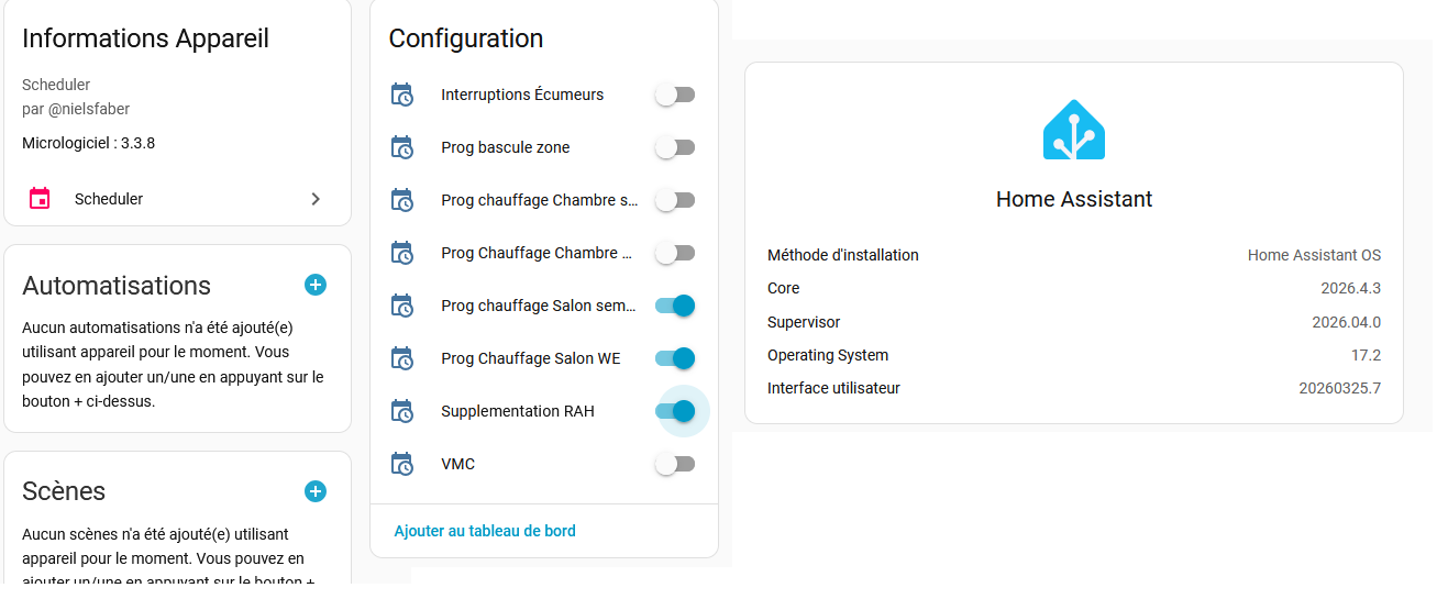 J’utilise de multiples Schedulers pour gérer mes automatismes (chauffage, etc) depuis mes débuts il y a quelques années avec HA. Ils sont fonctionnels. Les états changent bien aux horaires programmés. Je n’y touchais plus depuis des mois, sauf ce soir… J’avais besoin d’en modifier un.