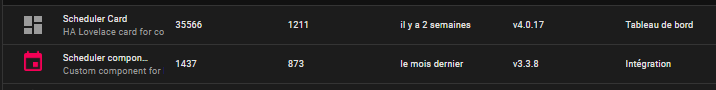 Au redémarrage de HA la mise à jour de HACS s’est faite toute seule, mais Scheduler-card n’était toujours pas là. Il m’a uste fallu le re-télécharger pour retrouver tous mes calendriers sans aucune perte.