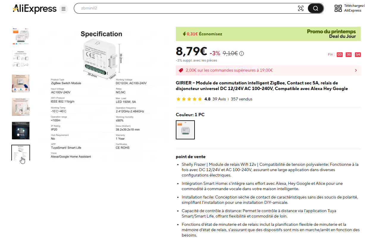 J’ai aussi en stock un SONOFF ZBMINI que j’ai jamais installé car ça ne rentre pas dans mes boites d’encastrement.