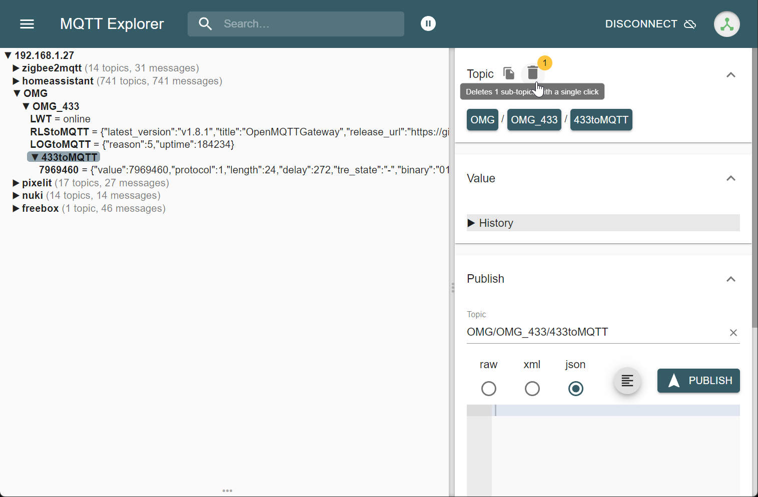 Chez moi j’ai sélectionné le topic 433toMQTT, toi tu peux supprimer directement le topic relay17760