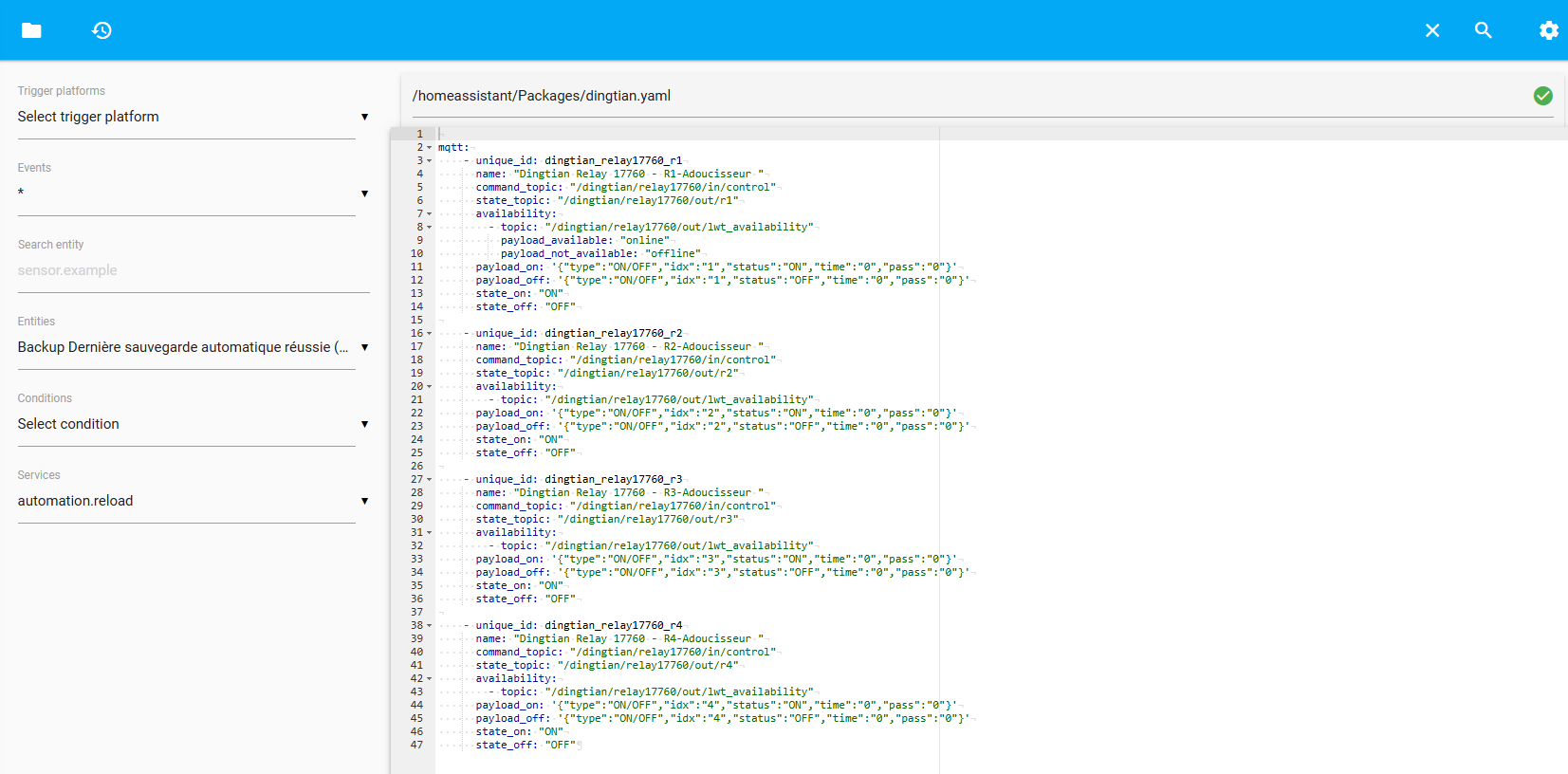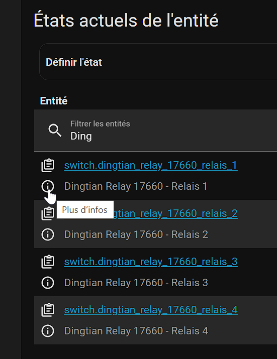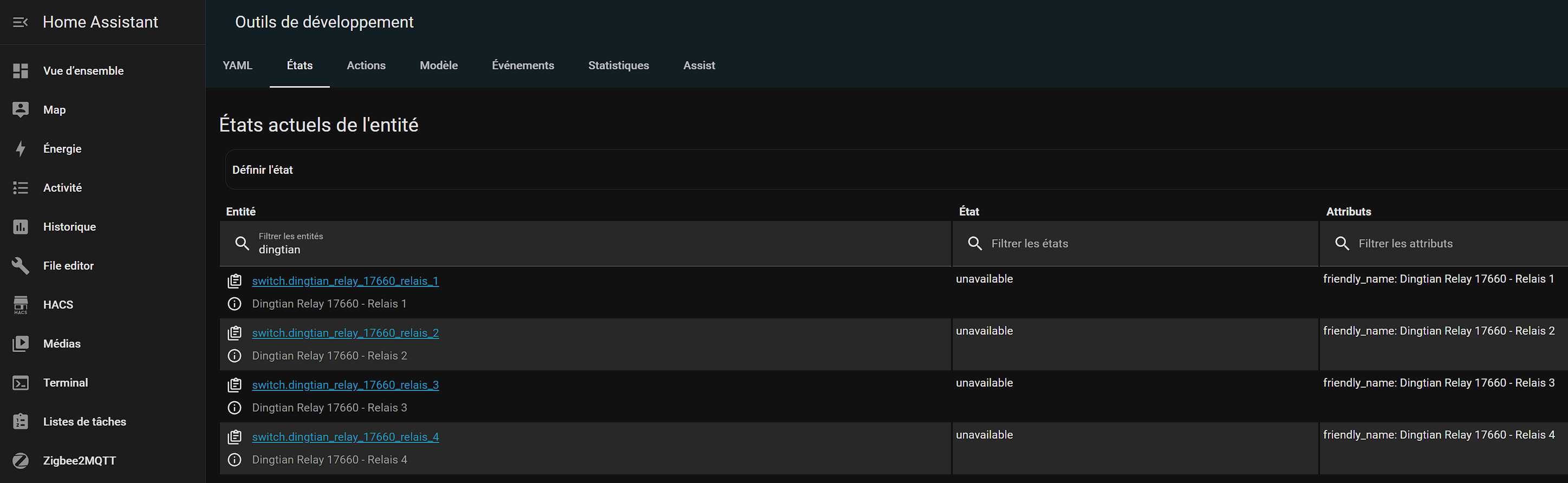 J’ai suivi un tuto, je n’ai aucune erreur de signaler dans HA mais je ne retrouve pas mes 4 relais dans Outils de développement/ Etat.
