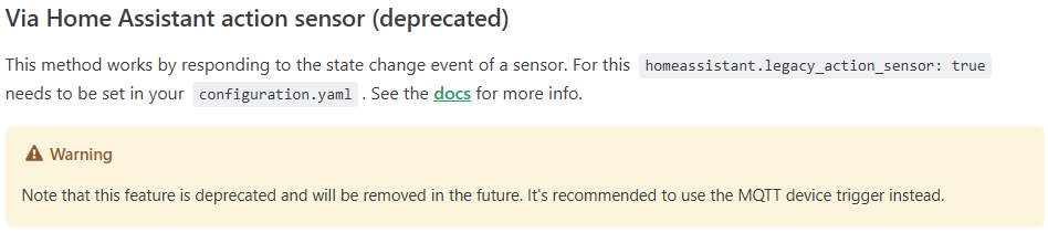 pour des interrupteurs, au lieu d’activer l’option pour récupérer l’entité action ( Home Assistant legacy action sensors) comme dans le lien de @ddfdom , je passerais au nouveau système par MQTT device triggers qui est la méthode recommendée. Car Home Assistant legacy action sensors sera supprimer dans le futur.