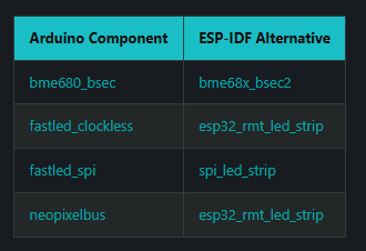 lire le guide de migration ou cas où tu utilises des composants pas compatibles esp-idf, il faudra les modifier avec d’autre :