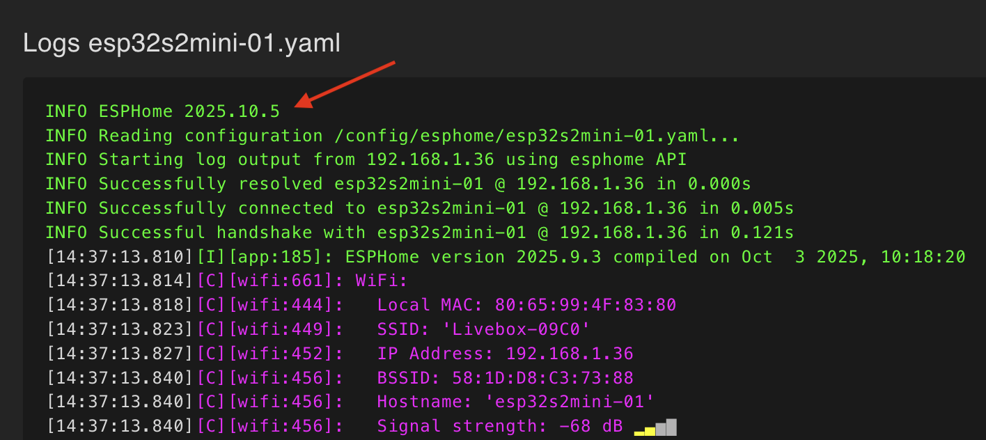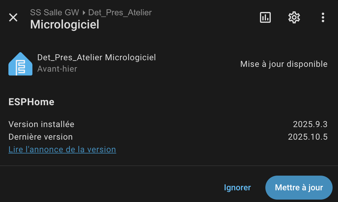 J’ai mes deux esp32S2mini pour lesquels une mise à jour 9.3 en 10.5 est constamment réclamée dans les paramètres HA, alors qu’elle semble avoir été enregistrée dans espHome.