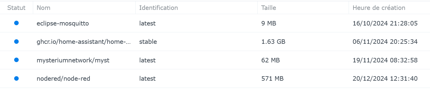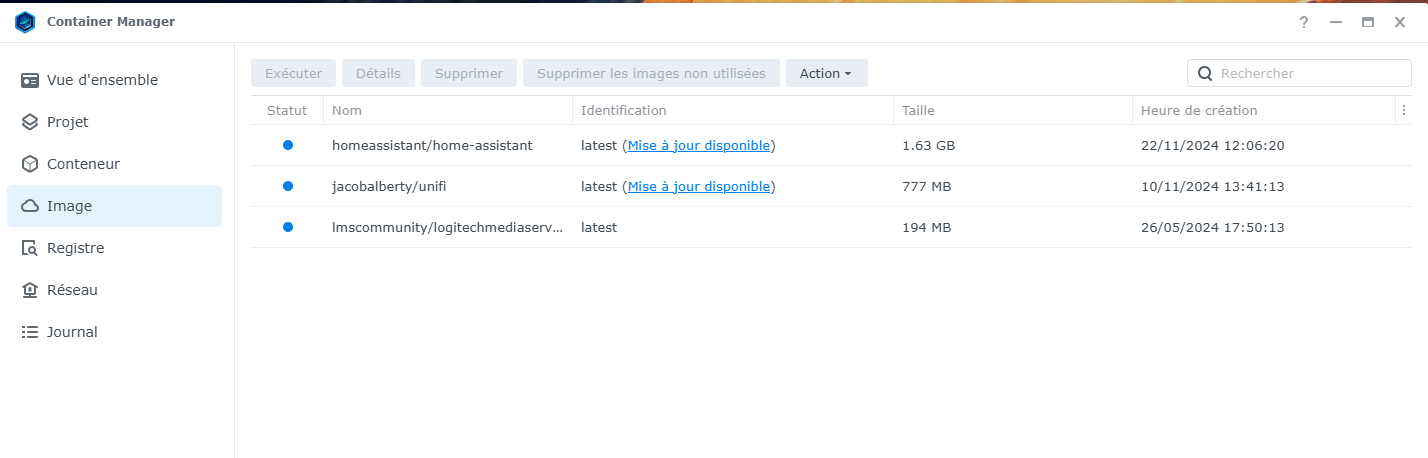 Si tu vas sur le container manager sur ton Synology, ensuite dans le menu, en sélectionnant « Image » ti dois avoir la liste de tes containers installés. Tu dois y voir HA, avec une mention « mise à jour disponible » ou quelque chose comme ça. Il suffit de clicquer sur ce lien pour mettre à jour le container en question. Image | Container Manager - Synology Centre de connaissances