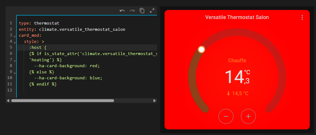 Je souhaiterai que la couleur d’arrière plan de ma carte chauffage change de couleur quand le thermostat se déclenche (passer du bleu au rouge pour indiquer la chauffe)