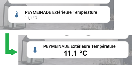 J’ai un capteur de température compatible TUYA que j’utilise avec SMARTLIFE ; je l’ai intégré à mon tableau de bord et j’aimerai savoir comment changer la taille et le style de la police des 11.1°C affichés par exemple ici ? Et par la même occasion de centrer cette température ?
