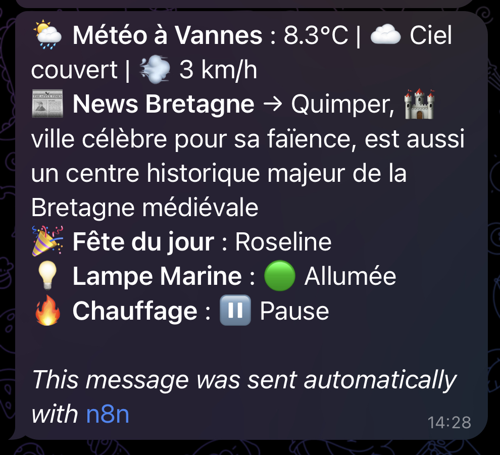 « Embelli le message html avec des icones sympas pour l’envoyer avec un format adapté à Telegram mais sans ajouter d’entête. Je souhaite une version compacte sans entête sur Telegram, aucun commentaire en plus de ce qui est demandé. »