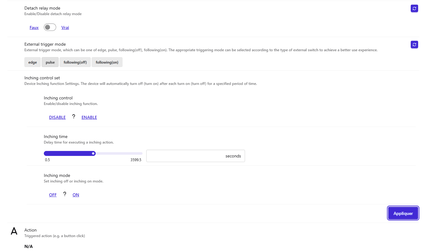 Quand je clique trois fois sur l’interrupteur, la lumière clignote trois fois : le mode poussoir semble fonctionner une première fois. Cependant, si je réessaie ou si j’alterne avec l’application Home Assistant, le comportement redevient normal (et non en mode poussoir).