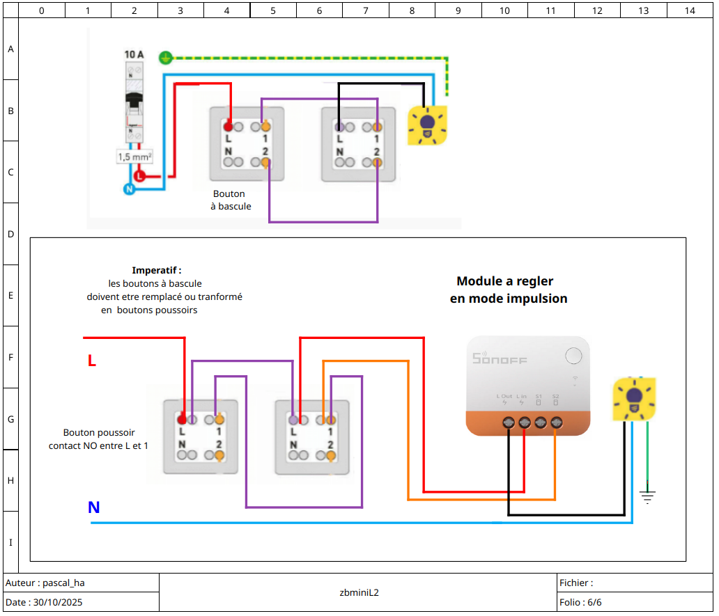 Je viens de construire ma maison et je souhaite domotiser mes éclairages. J’ai acquis un module Sonoff ZBMINIR2, mais je rencontre des difficultés pour le câbler correctement dans une configuration avec un va-et-vient et un interrupteur simple. Malgré plusieurs tutoriels et la notice constructeur, je n’arrive pas à faire fonctionner l’éclairage depuis Home Assistant : le module est bien intégré, mais la lumière ne s’allume pas, Peut-être que je me trompe avec les 2 câbles navettes ou une des 2 phases qui doit servir de pont pour une autre lumière.