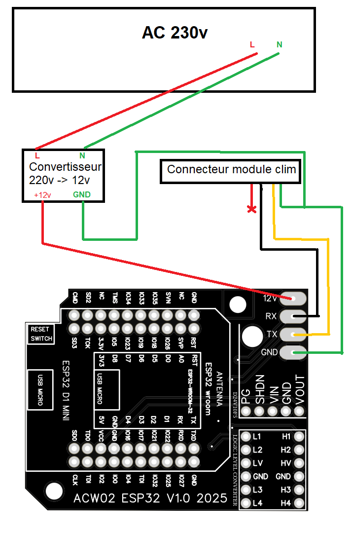 faudrait avoir un retour d’utilisateur qui utilise le module sur airton, sinon si c’est juste que la clim ne fournis pas assez d’ampérage pour le module, car ca peut être juste ca (car l’esp32 consomme plus que l’acw02), tu pourrais mettre un convertisseur 220v vers 12v, connecter les 12v au module et le gnd , et coté câble d’origine faut mettre les masse en commun