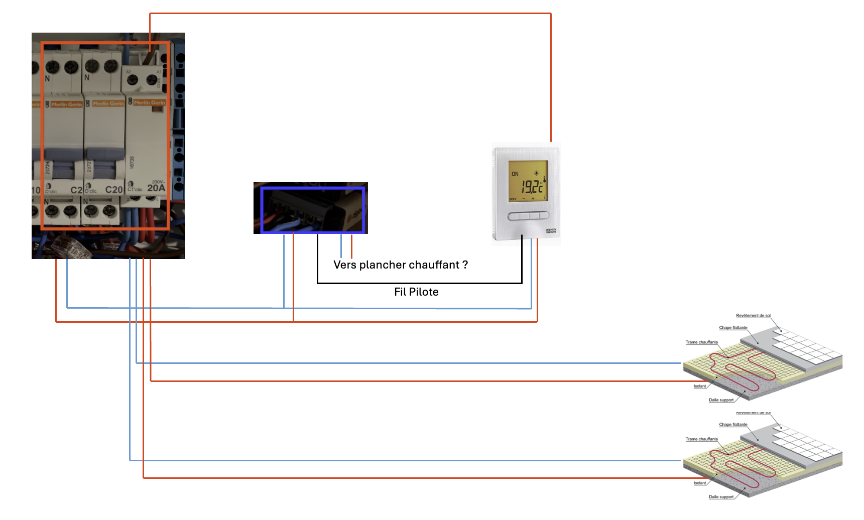 au mur le Thermostat Delta Dore, la sortie vers le radiateur repart en fait vers le tableau électrique avec un seul fil pour commander le relais des deux zones électrique