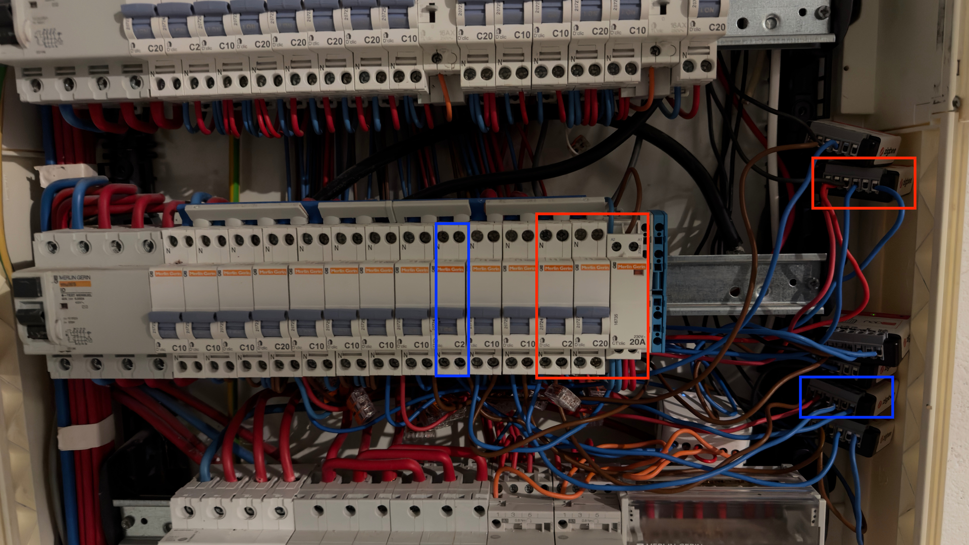 J’ai 6 zones, pour 5 l’installation était rapide et simple (en bleu), c’est la dernière du salon qui me pose problème (en rouge) car elle dispose de deux zones ensemble avec plus de modules au tableau électrique. Je ne sais pas comment brancher le module Nodon pour la mesure de la puissance des deux zones ensemble ?