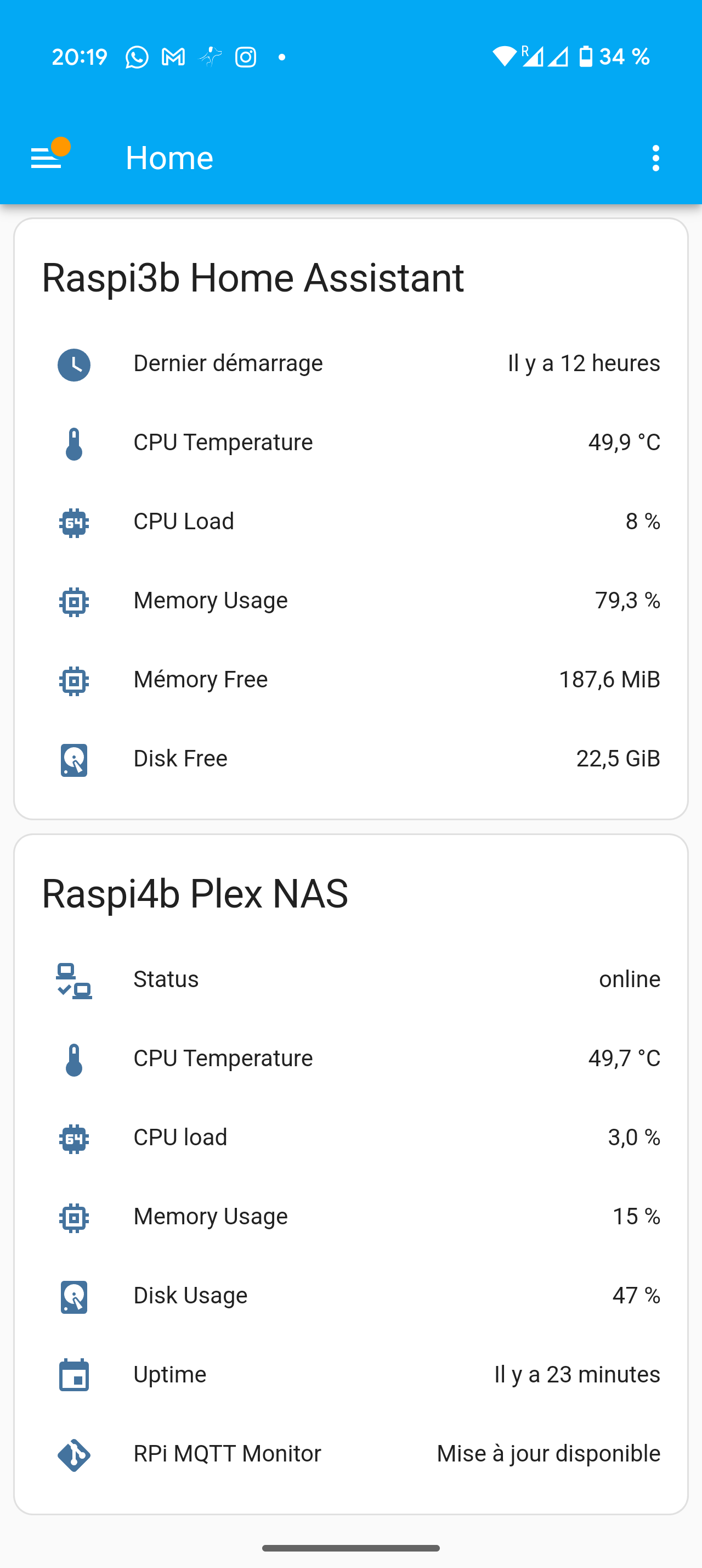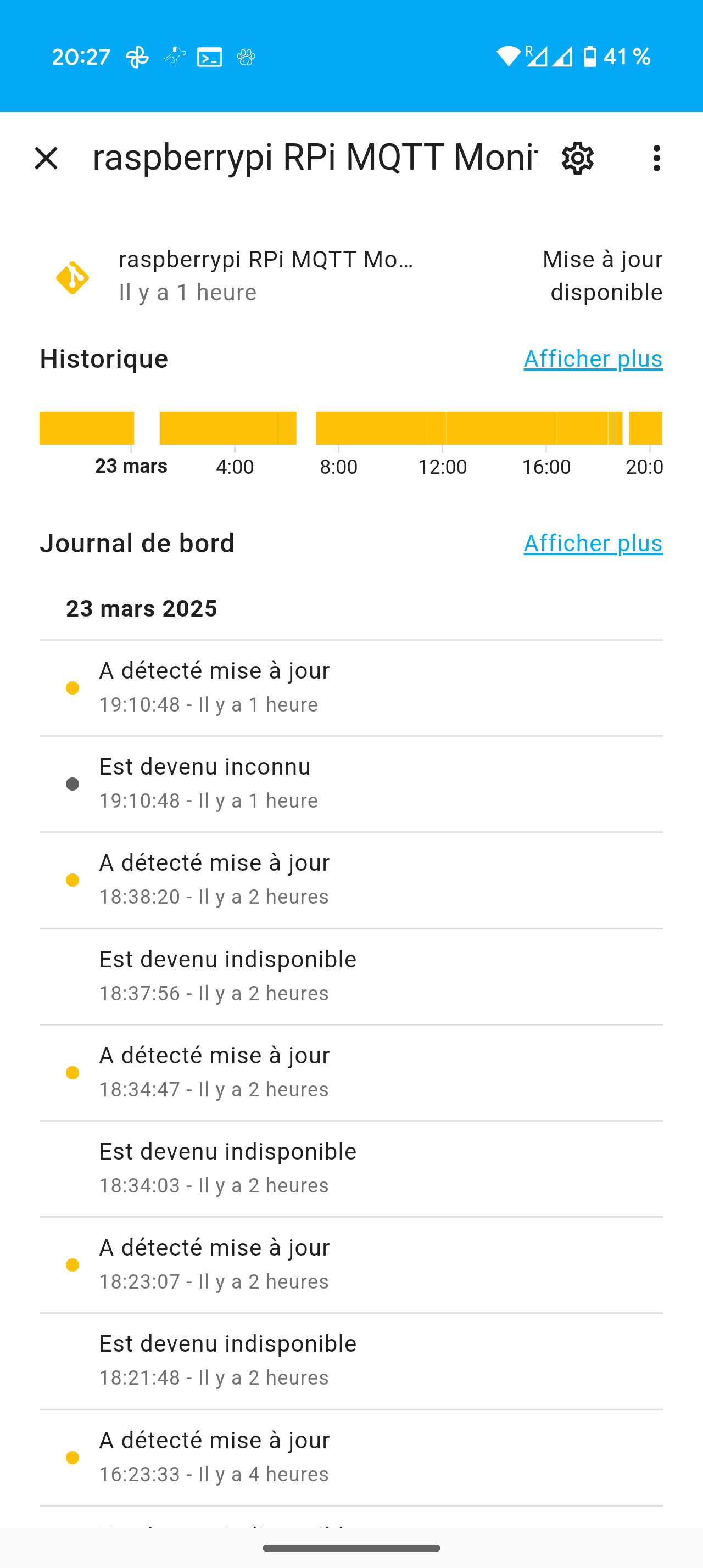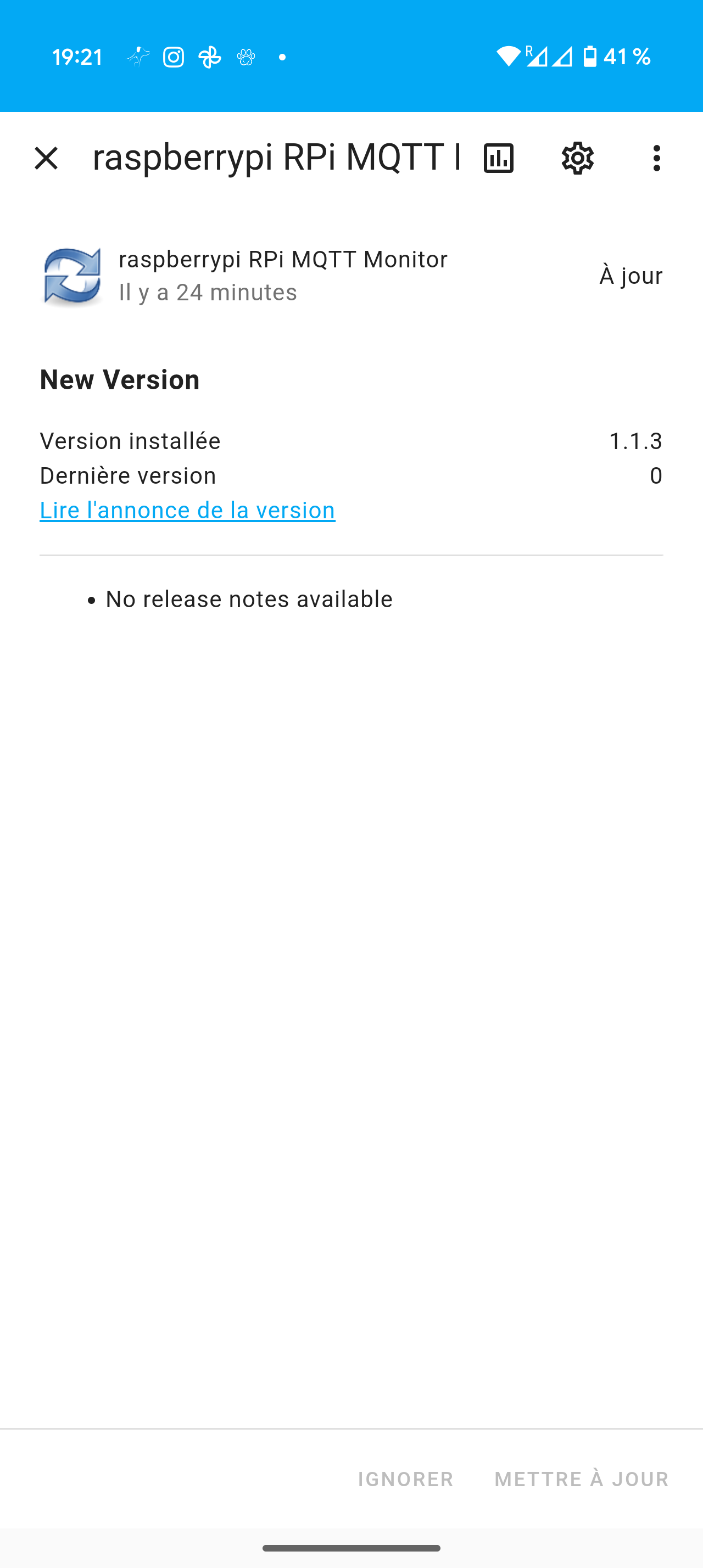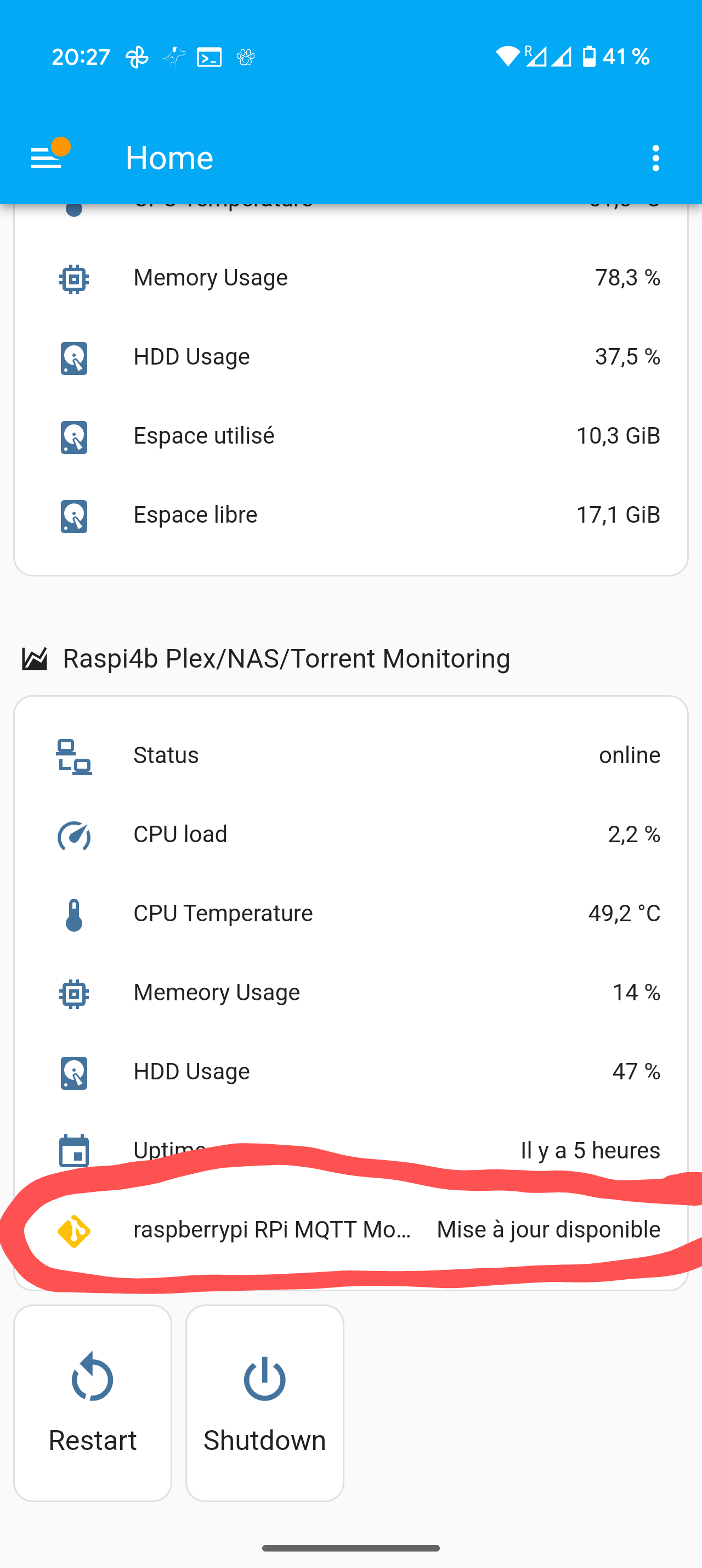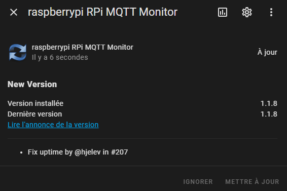 J’ai essayé sudo apt-get update & sudo apt-get upgrade sur le raspberry pi avec le serveur Pex/Nas mais après les mises a jours, sur mon dashboard, ça continue a me dire qu’il y a une mise a jour de Rpi-MQTT-monitor disponible.