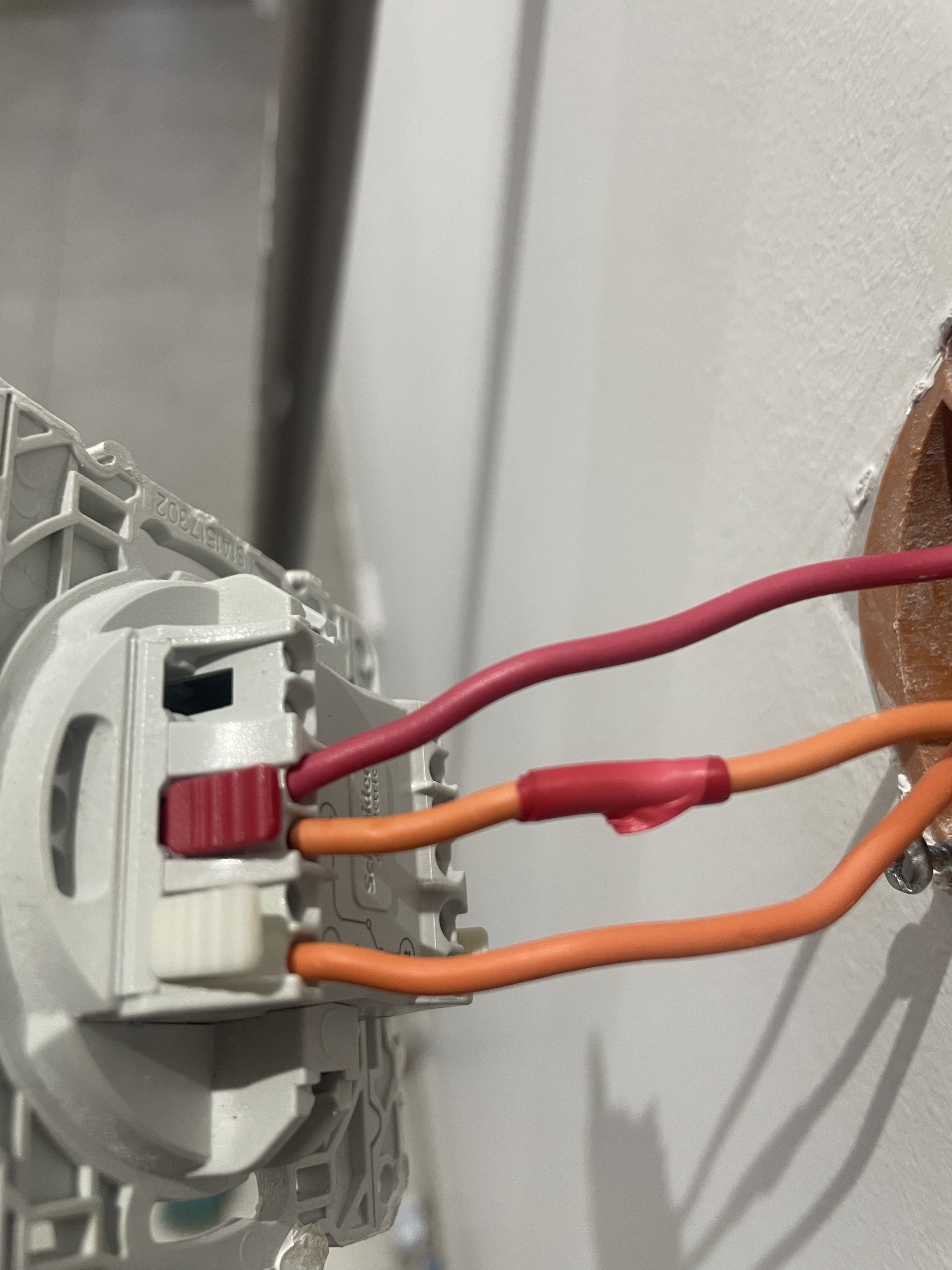 Je pensais pouvoir dupliquer ce que j’ai fait précédemment mais sur celui-ci, j’ai à faire avec un interrupteur double et je ne retrouve pas les mêmes couleurs de fils (je n’ai ni violet, et j’ai un marron).