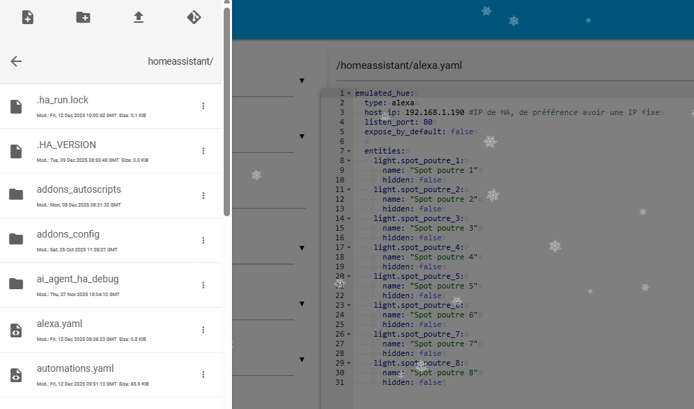 Voila ce que je veux faire, mettre mes ampoules HA dans Alexa, ca fonctionne si je met tout dans le fichier configuration.yaml, mais pas dans Alexa.yaml, que j’ai pourtant ajouté dans configuration.yaml.