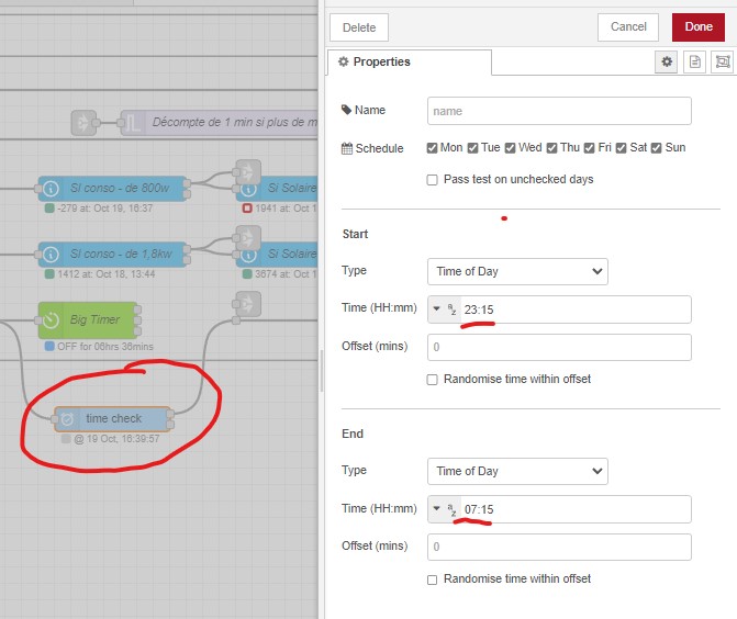 Pour rajouter à la difficulté du choix… dans la mesure du possible, il faut choisir des noeuds qui sont maintenus/mis à jour « regulièrement ». Typiquement celui que tu as pris node-red-contrib-timecheck (node) - Node-RED n’a pas été mis à jour depuis 7 ans alors que node-red-contrib-time-range-switch (node) - Node-RED ou node-red-contrib-chronos (node) - Node-RED qui permettent la même chose ont des mises à jour plus récentes. Ca peut être important parce qu’un noeud non maintenu peut ne plus marcher avec une nouvelle version de node.js (le langage sous nodered).